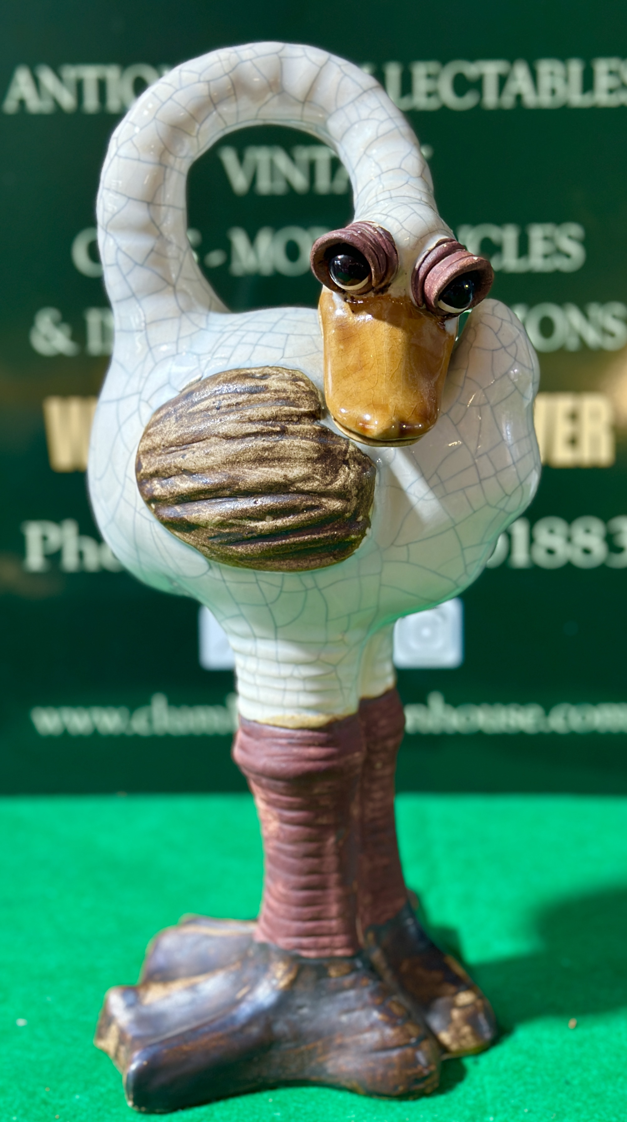 A large studio pottery ceramic figure of a bird, possibly a duck or goose, rendered in a whimsical style. The piece features an elongated neck that curves into a loop, large protruding eyes with heavy concentric lids, and oversized webbed feet. The main body and neck are finished in a white raku-style crackle glaze, while the bill is decorated with a smooth amber-coloured glaze. The eye surrounds and legs are formed from matte terracotta-toned clay. The wings are represented by two heavily textured, horizontally ribbed circular patches with a brown finish. The large webbed feet are finished with a dark metallic bronze-effect glaze. No maker’s marks or signatures are visible on the exterior of the piece.