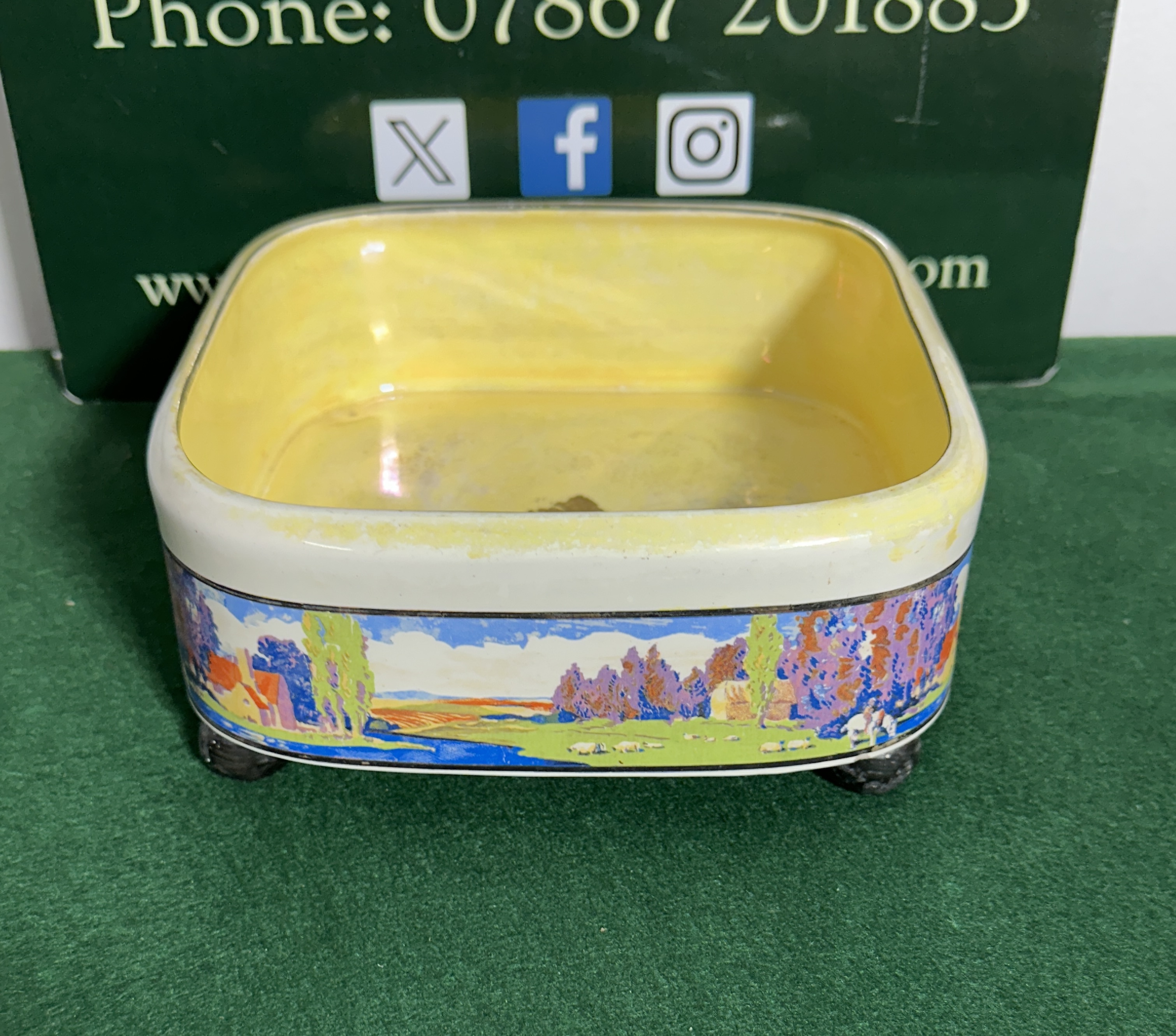A square-form bowl manufactured by Lancaster and Sons, Hanley, Stoke-on-Trent, dating to the Art Deco period, circa 1930s. The bowl is of squat form with rounded corners and is supported by four small black-glazed bun feet. The exterior features a continuous transfer-printed rural landscape decoration, hand-coloured with shades of blue, green, orange, and purple, depicting cottages, trees, and sheep in a field. The interior is finished with a bright yellow lustre glaze. The rim and lower body are accented with thin black-painted horizontal bands. The base bears a black printed factory mark for Lancaster and Sons, featuring a pottery building silhouette with the word HANLEY above and MADE IN ENGLAND below. The base also features the hand-painted number 426.