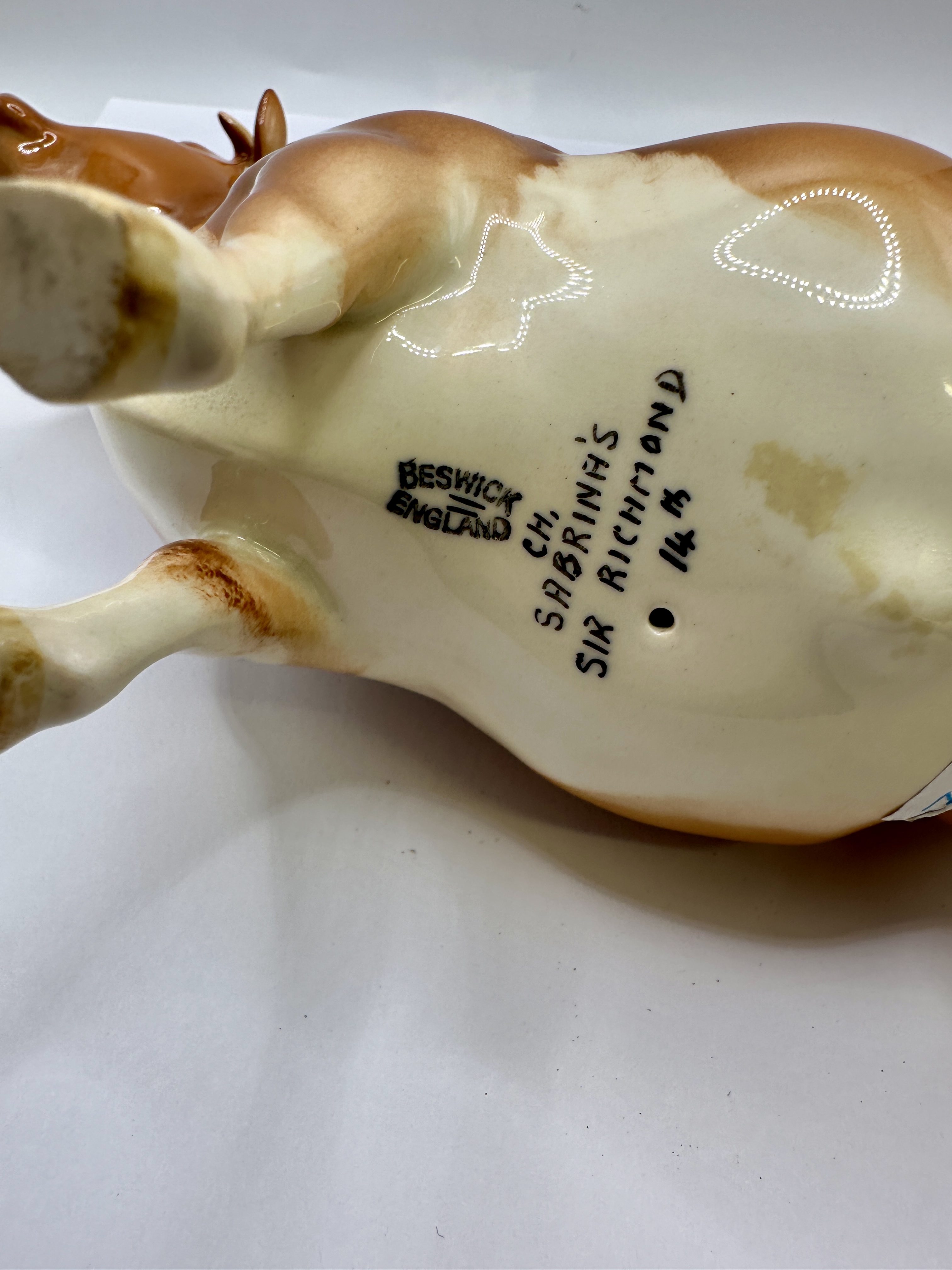 A Beswick ceramic figurine of the Guernsey bull Champion Sabrina’s Sir Richmond 14th, model number 1451. Designed by Colin Melbourne and manufactured in Stoke-on-Trent, England, the figure is naturalistically modelled in a standing pose. The piece is finished in a high-gloss glaze with chestnut and white markings, cream-coloured horns, and hooves. The underside features a black stamped factory mark for BESWICK ENGLAND and a hand-painted inscription in black script reading CH. SABRINA’S SIR RICHMOND 14th. A small circular firing vent is present on the underside of the belly.