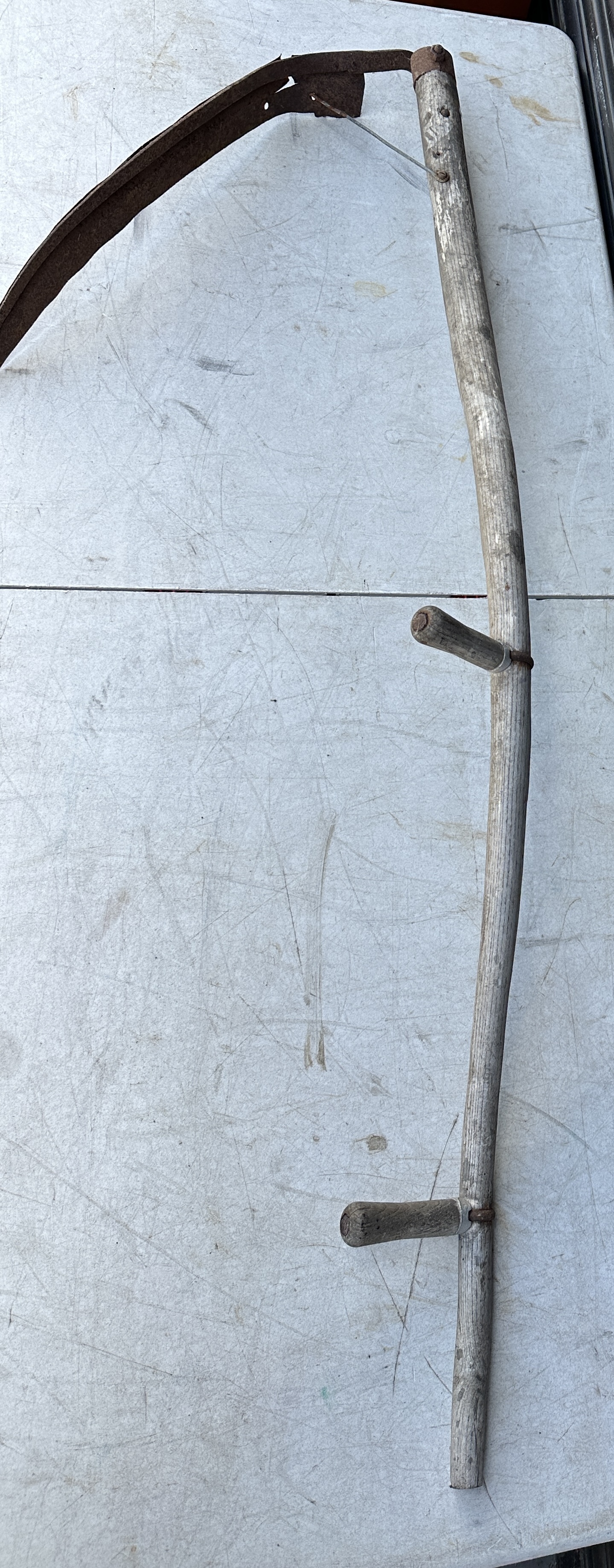 The scythe is in as found country condition. The steel blade exhibits heavy oxidation and a thick layer of surface rust throughout, with a dull cutting edge. The wooden snath shows significant weathering with a grey patina and visible surface shaking consistent with age and outdoor exposure. The metal fittings and rings are rusted but appear structurally sound. The tool is complete with its original components and is suitable for decorative or historical display.