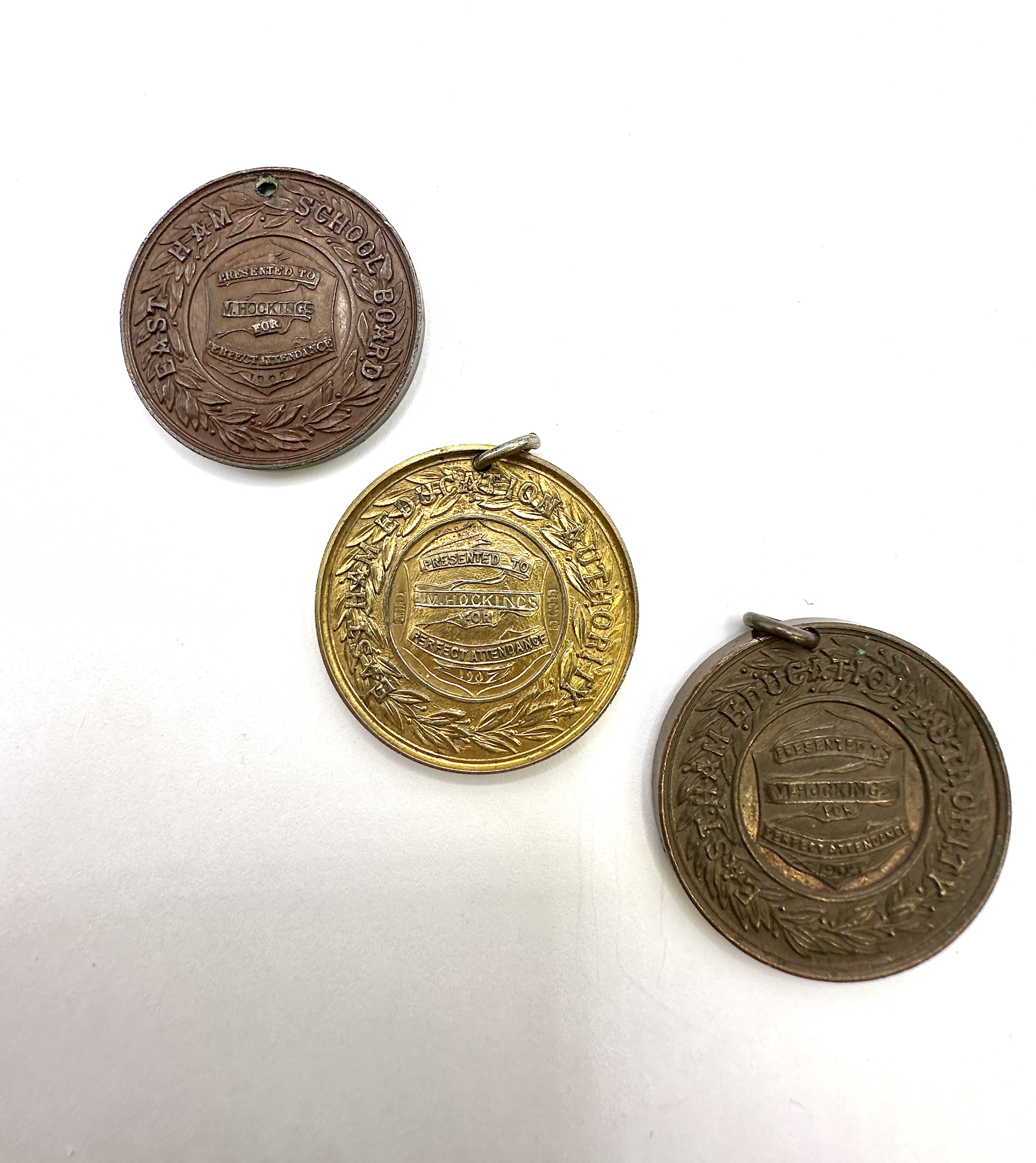 A trio of early 20th-century educational commemorative medals from the East Ham district of London, all awarded to the same recipient, V. Hockings, for perfect school attendance. The lot comprises one silver-gilt medal and two bronze-coloured copper-alloy medals, representing the transition from the East Ham School Board to the East Ham Education Authority following the Education Act of 1902.
