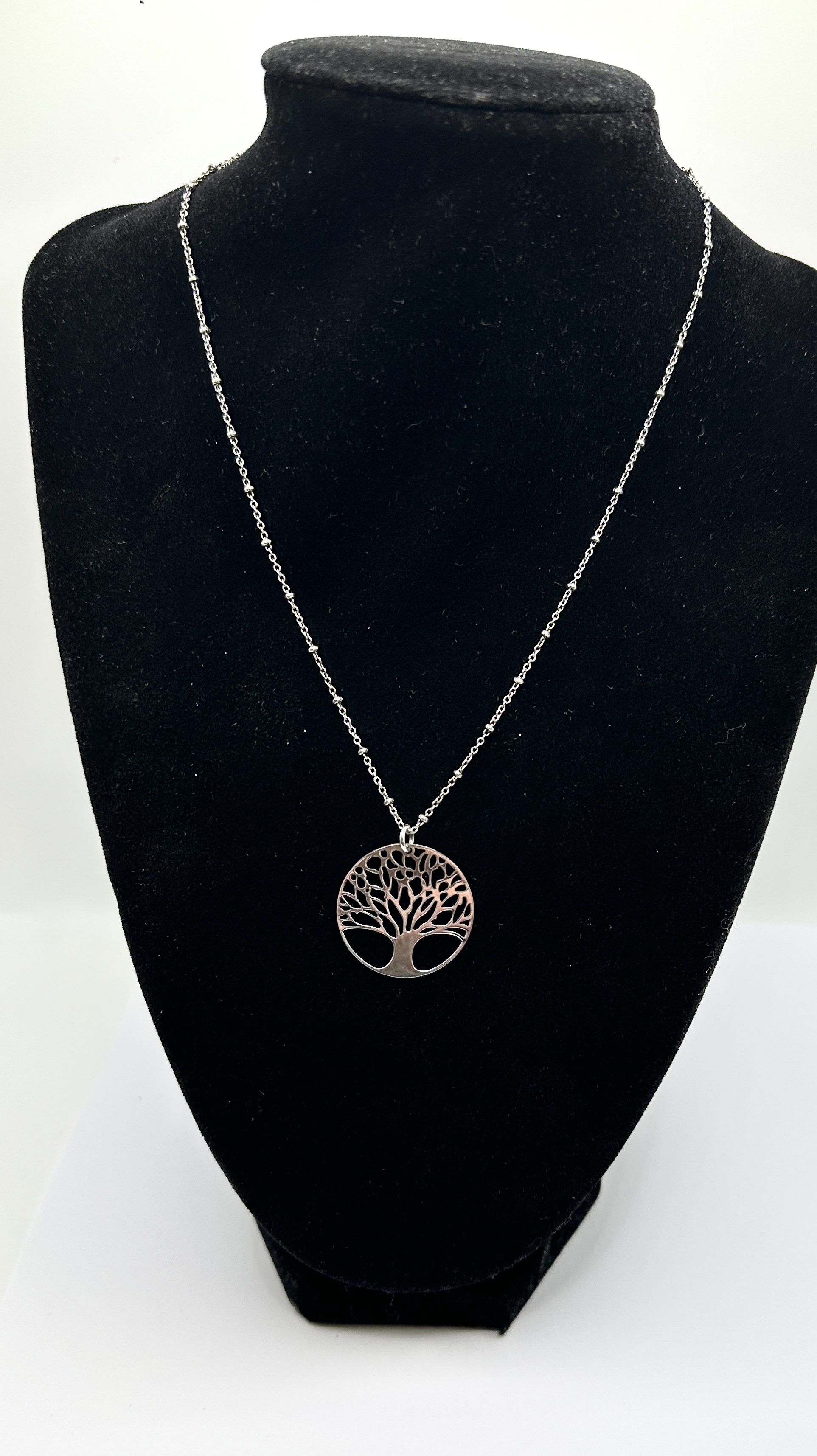 A 925 silver necklace featuring a circular pendant with a pierced openwork Tree of Life motif. The pendant is suspended from a satellite-style chain, comprising a trace link chain with integrated spherical bead stations at regular intervals. The necklace is secured with a lobster claw clasp.