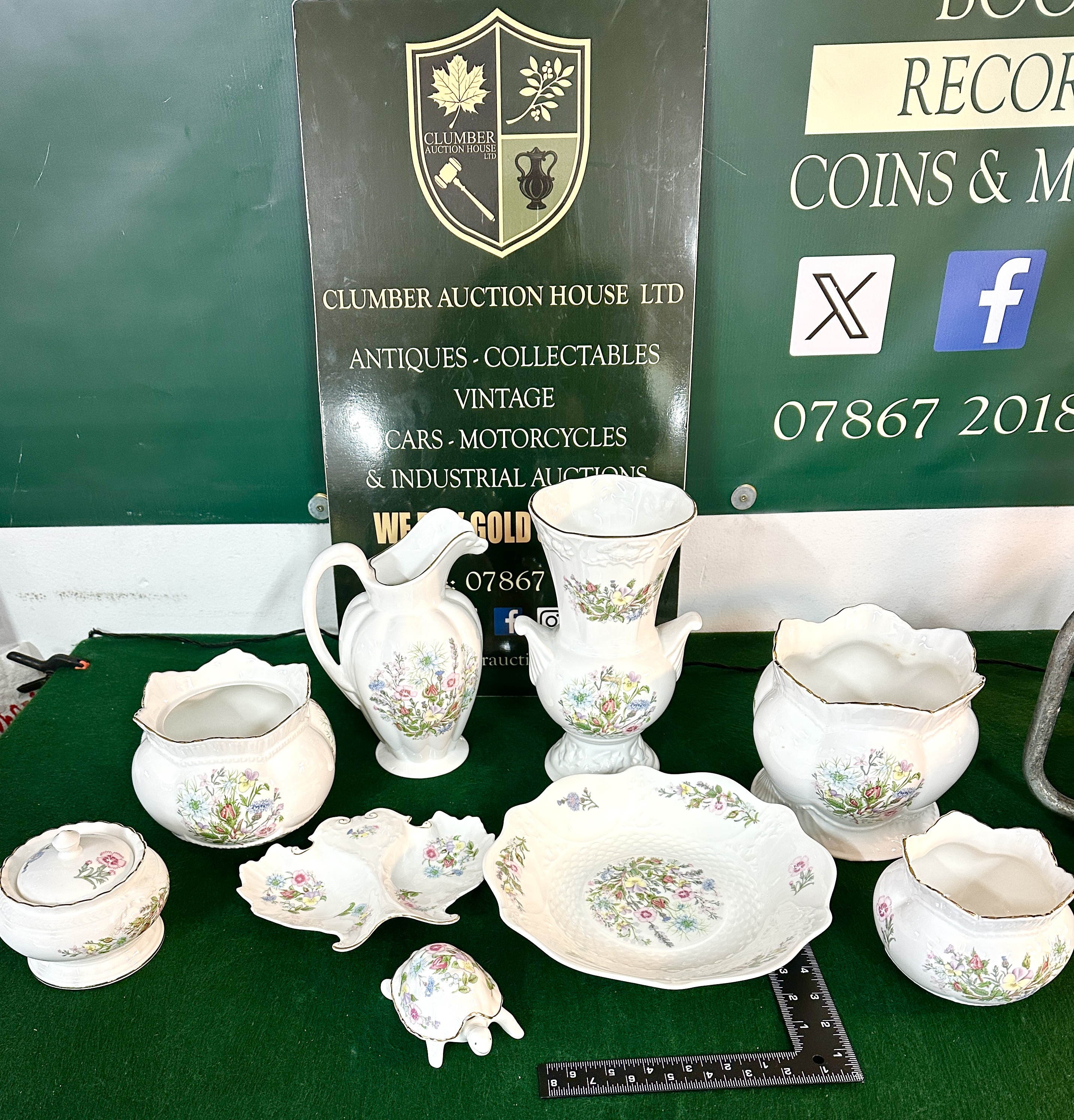 A collection of nine Aynsley fine bone china items decorated in the Wild Tudor pattern. Each piece is constructed from white fine bone china and features transfer-printed colourful wildflower sprays including roses, pansies, cornflowers, and forget-me-nots. The collection comprises a large twin-handled pedestal vase with a flared wavy rim, a water pitcher with a scroll handle, a large open bowl with a scalloped rim, and two smaller bowls of differing sizes. Further items include a lidded pot, a shallow scalloped serving dish, a leaf-shaped divided dish, and a decorative figurine in the form of a turtle. Most items are finished with a gilt rim, and several pieces exhibit an embossed basketweave or diamond texture to the ceramic body. The bases bear the blue printed factory mark featuring a crown above a banner with the name Aynsley, alongside the text Est. 1775, Wild Tudor, Fine Bone China, and Made in England. A single blue character A is printed to the right of the main mark.