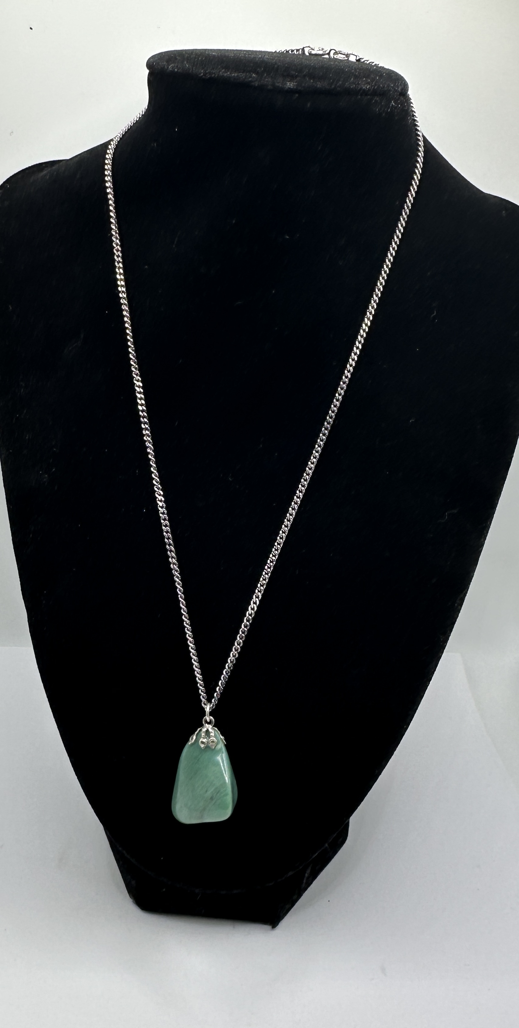 A necklace featuring a 925 silver pendant and chain. The pendant consists of a single polished green hardstone of irregular tumbled drop form, exhibiting natural internal veining and inclusions. The stone is secured by a 925 silver cap-style bail featuring decorative embossed scrolling motifs. The pendant is suspended from a fine curb link chain fitted with a spring-ring style clasp.