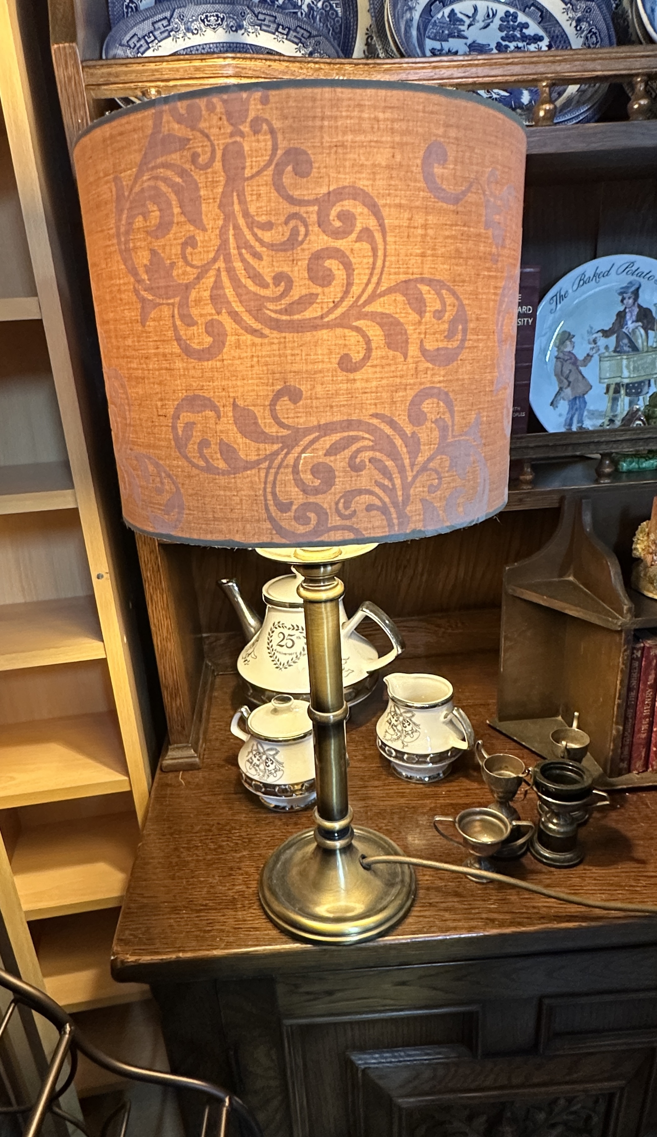 The lamp is in good overall condition. There is minor surface wear and light tarnishing to the brass-finished metal, consistent with age and typical use. The shade remains intact and is free from major staining or damage.