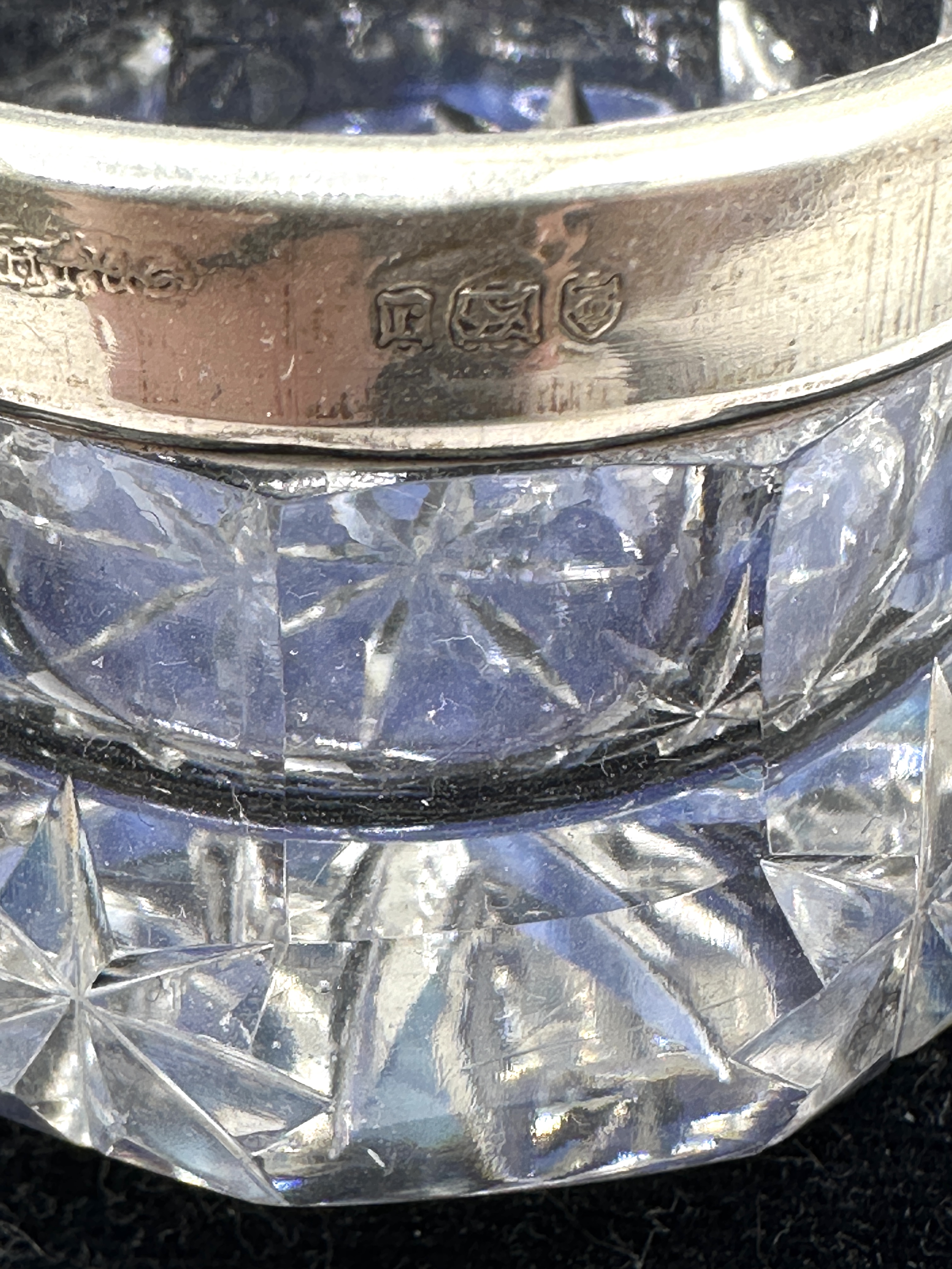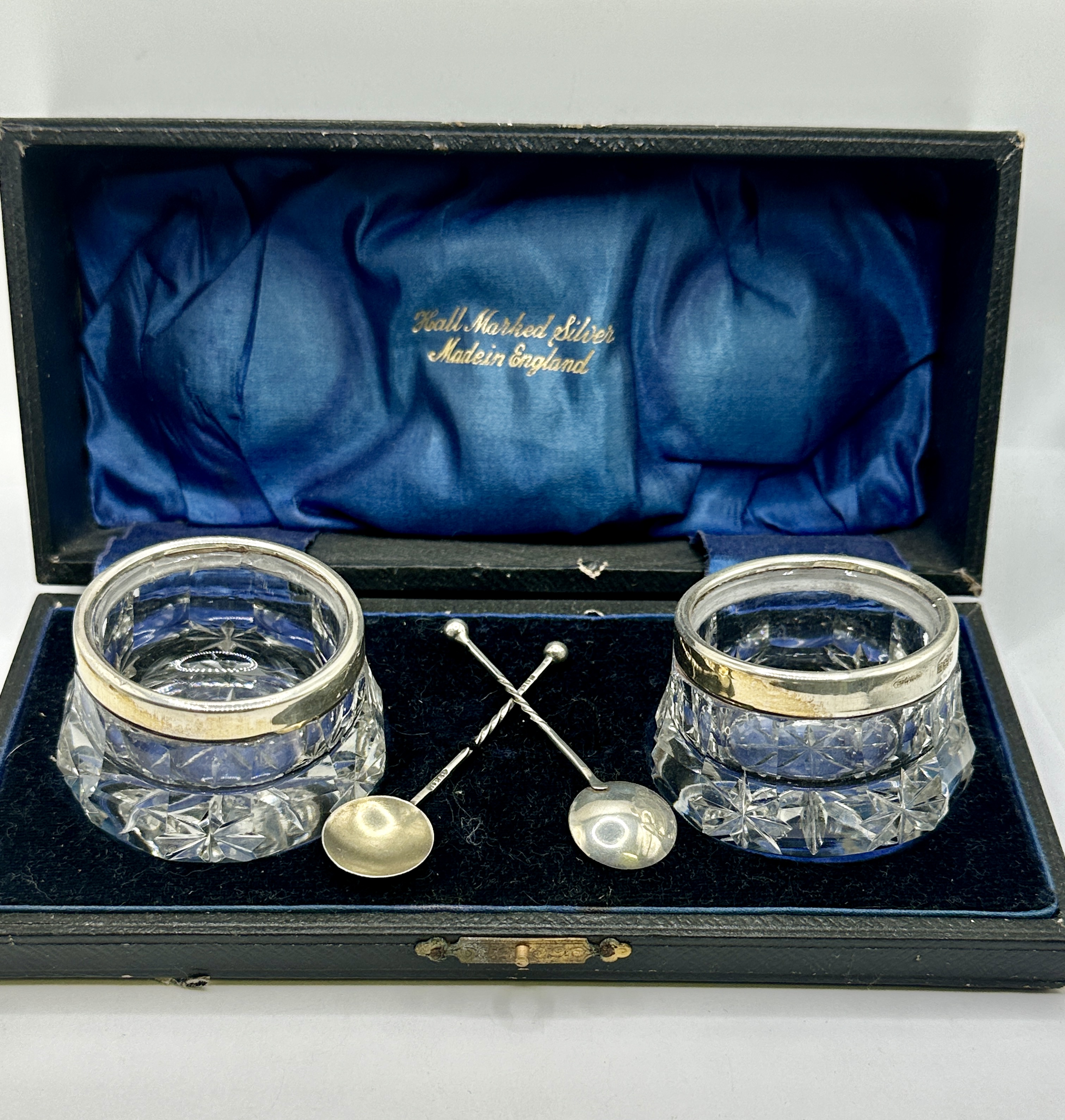 A pair of circular open salt cellars featuring heavy cut glass bodies and hallmarked 925 silver mounts to the rims. The glass is decorated with a deep geometric pattern, consisting of a band of large diamond-shaped facets above a star-cut base. The set is accompanied by two 925 silver salt spoons featuring twisted stems and ball finials. All items are housed in the original fitted presentation case with a blue satin and velvet-lined interior. The interior lid is gold-stamped with the text Hall Marked Silver Made in England. The hallmarks on the silver mounts of the salt cellars correspond to Birmingham, 1916, and include the lion passant symbol for 925 silver. The salt spoons bear hallmarks for London, 1924, also including the lion passant symbol for 925 silver.