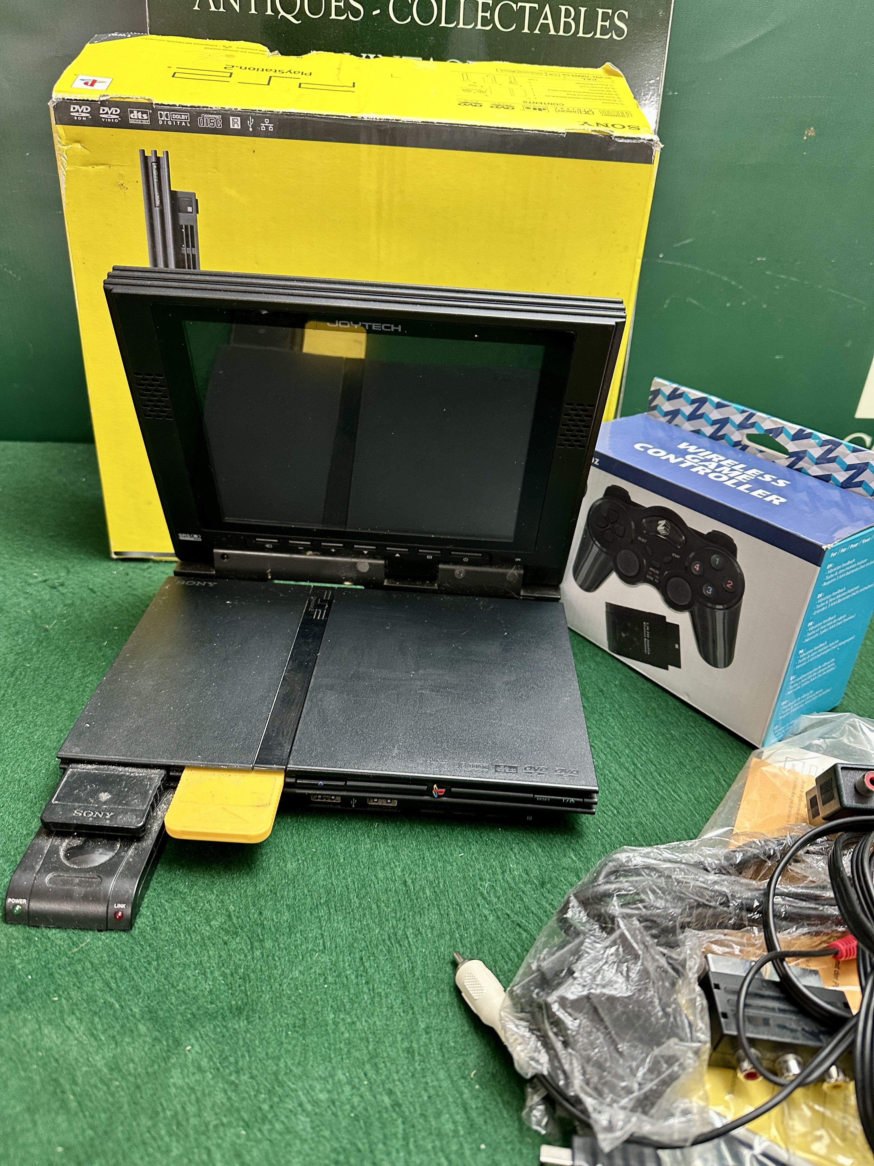 A collection of Sony PlayStation 2 gaming equipment featuring a charcoal black PS2 console fitted with a Joytech integrated flip-up LCD screen attachment. The lot includes the original Sony yellow retail box, a boxed ZedLabz wireless controller with its respective receiver, a Sony branded infrared receiver, and a yellow memory card. Associated peripherals comprise a power supply unit, composite AV cables, a Scart adapter, and original printed instruction manuals. The console unit displays the manufacturer markings Sony and PlayStation 2, while the screen attachment is marked Joytech. The console features two front-facing controller ports and two USB ports. The integrated screen includes built-in speakers and manual control buttons for display adjustments.
