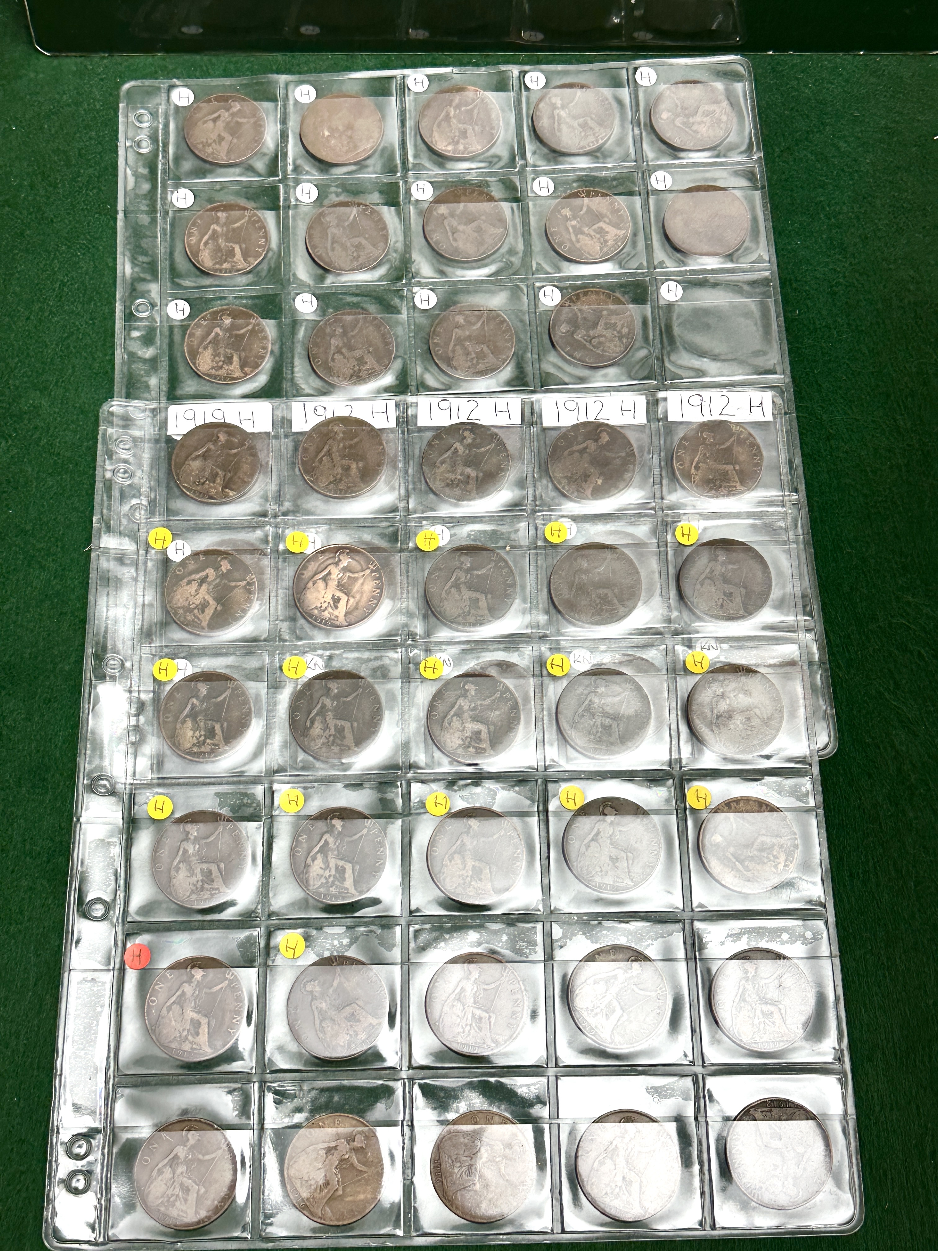 A collection of UK bronze pennies dating from the reign of King George V. The group predominantly features issues from 1912, 1918, and 1919. Specific mint marks are identified on the coins and accompanying labels, including H for the Heaton Mint (The Mint, Birmingham) and KN for the Kings Norton Metal Co. Ltd. The reverse of each coin displays the seated figure of Britannia with a trident and shield, the legend ONE PENNY, and the date in the exergue. The obverse features the bare head portrait of King George V. The coins are housed in plastic storage pages and are accompanied by handwritten labels and stickers indicating the date and mint mark.