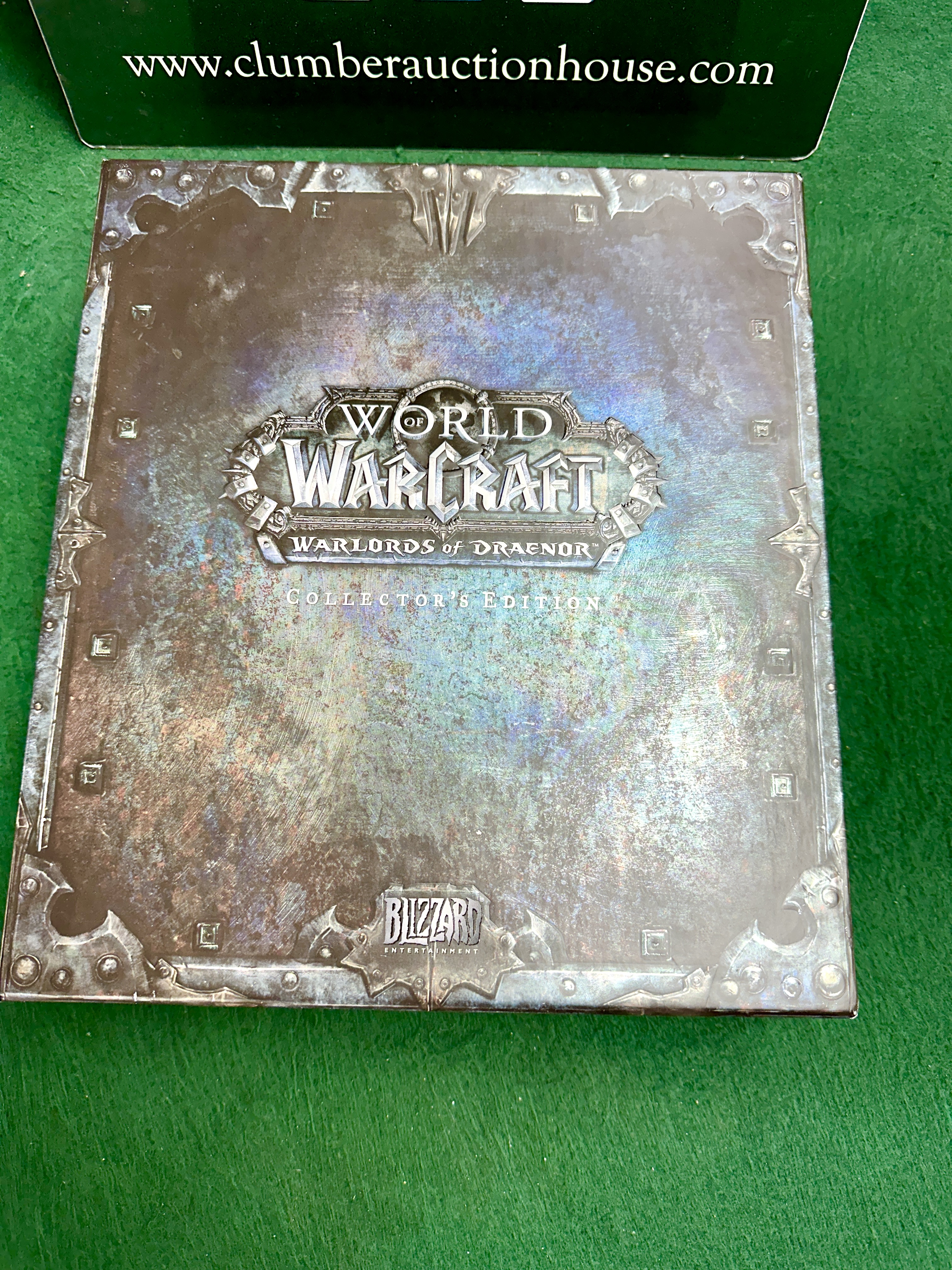 A Blizzard Entertainment World of Warcraft Warlords of Draenor Collector’s Edition box set. The collection includes a large decorative outer collector’s box made of heavy gauge card with a textured finish, a hardcover art book titled The Art of World of Warcraft Warlords of Draenor, and a fabric-topped mouse pad featuring game artwork of Blackhand. Also included are a behind-the-scenes two-disc set in both DVD and Blu-ray formats, a collector’s edition soundtrack CD, and the game DVD-ROM in a plastic case. A printed informational insert is also present. The packaging features PEGI 12 age rating labels, identifying this as a European market release.