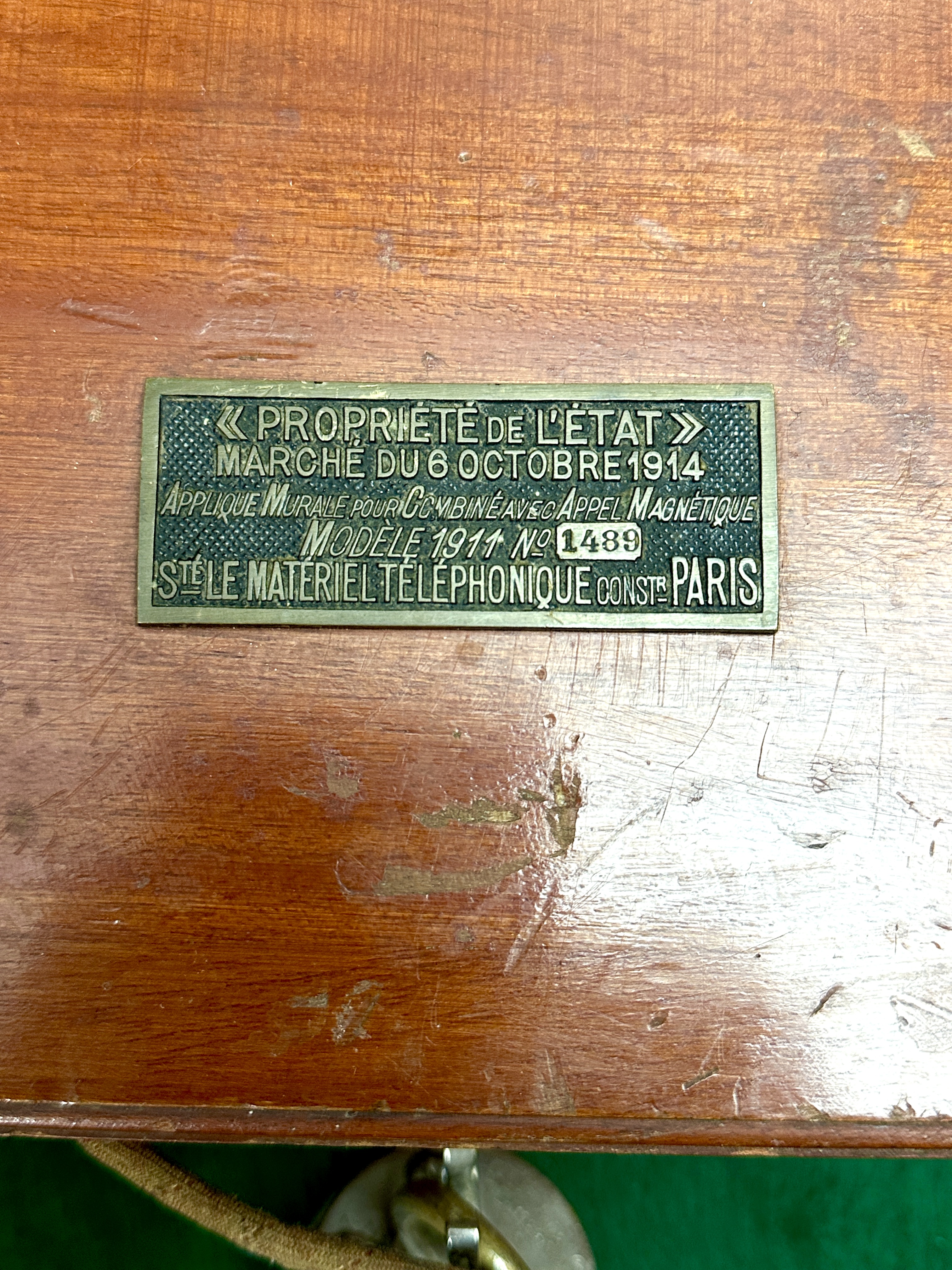 A French Modèle 1911 magneto wall telephone manufactured by Société Le Matériel Téléphonique (LMT) in Paris. The unit is housed in a rectangular reddish-brown polished wood cabinet featuring dovetail joint construction. A metal hand crank for the magneto generator is mounted on the right side. The top of the cabinet bears an original brass identification plate stamped with the following text: « PROPRIÉTÉ DE L’ÉTAT », MARCHE DU 6 OCTOBRE 1914, APPLIQUE MURALE POUR COMBINÉ AVEC APPEL MAGNÉTIQUE, MODELE 1911 NO 1489, and STÉ LE MATÉRIEL TÉLÉPHONIQUE CONSTR PARIS. This indicates the telephone was produced under a French state contract dated 6 October 1914. The apparatus includes a combined handset with chrome-finished metal ends and a black textured grip, as well as a separate secondary receiver earpiece suspended from a metal hook on the front face. The components are connected via a combination of braided fabric-covered and rubber-insulated wiring.
