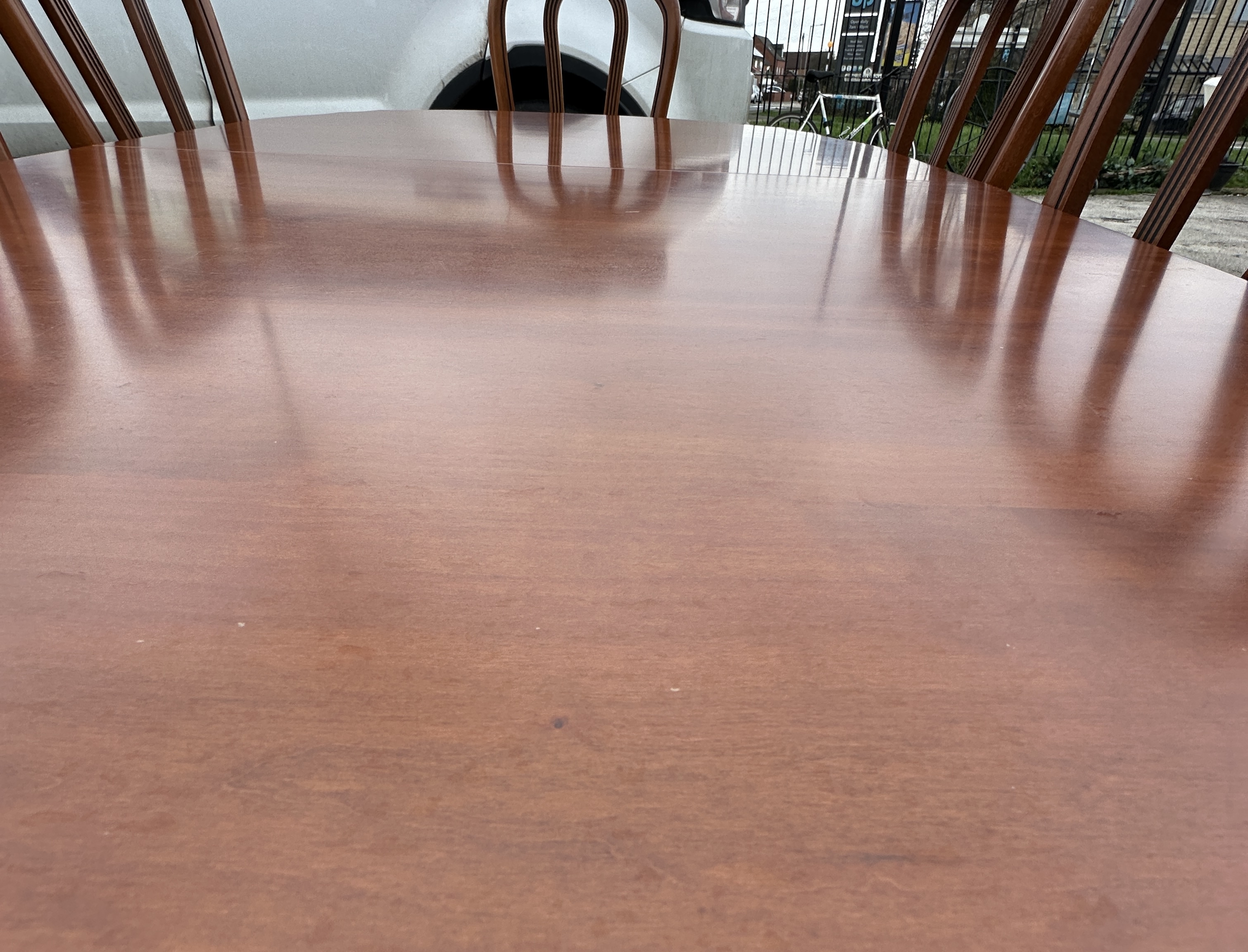 The suite is in good overall condition. The tabletop displays minor signs of use, including light surface scratches and several small white marks to the finish. The upholstery on the chairs remains clean and well-maintained. The structural integrity of the table and chairs appears sound.