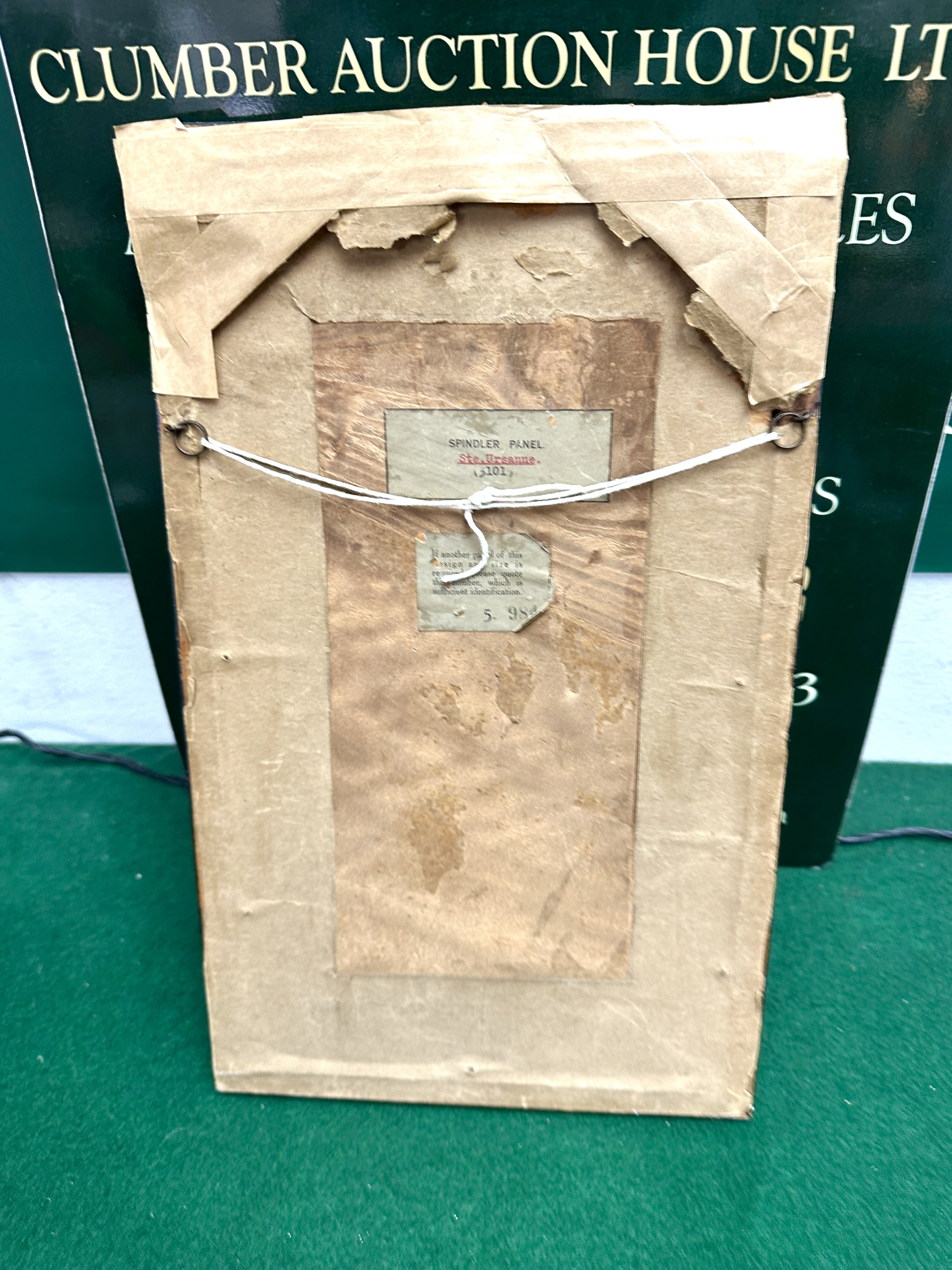 A marquetry wood veneer panel by Charles Spindler depicting the town of Saint-Ursanne, Switzerland. The pictorial scene features a central arched stone gateway, a building with a prominent tiered tower and spire, and a large tree with textured burr-wood foliage. The composition is constructed from various inlaid wood veneers of differing grains and colours to create depth and detail. Signed in the lower right: Spindler. The verso retains two printed labels; the primary label reads SPINDLER PANEL / Ste. Ursanne / 2101, and a smaller secondary label includes the reference number 5. 984. The piece is presented in a dark, figured wood frame.