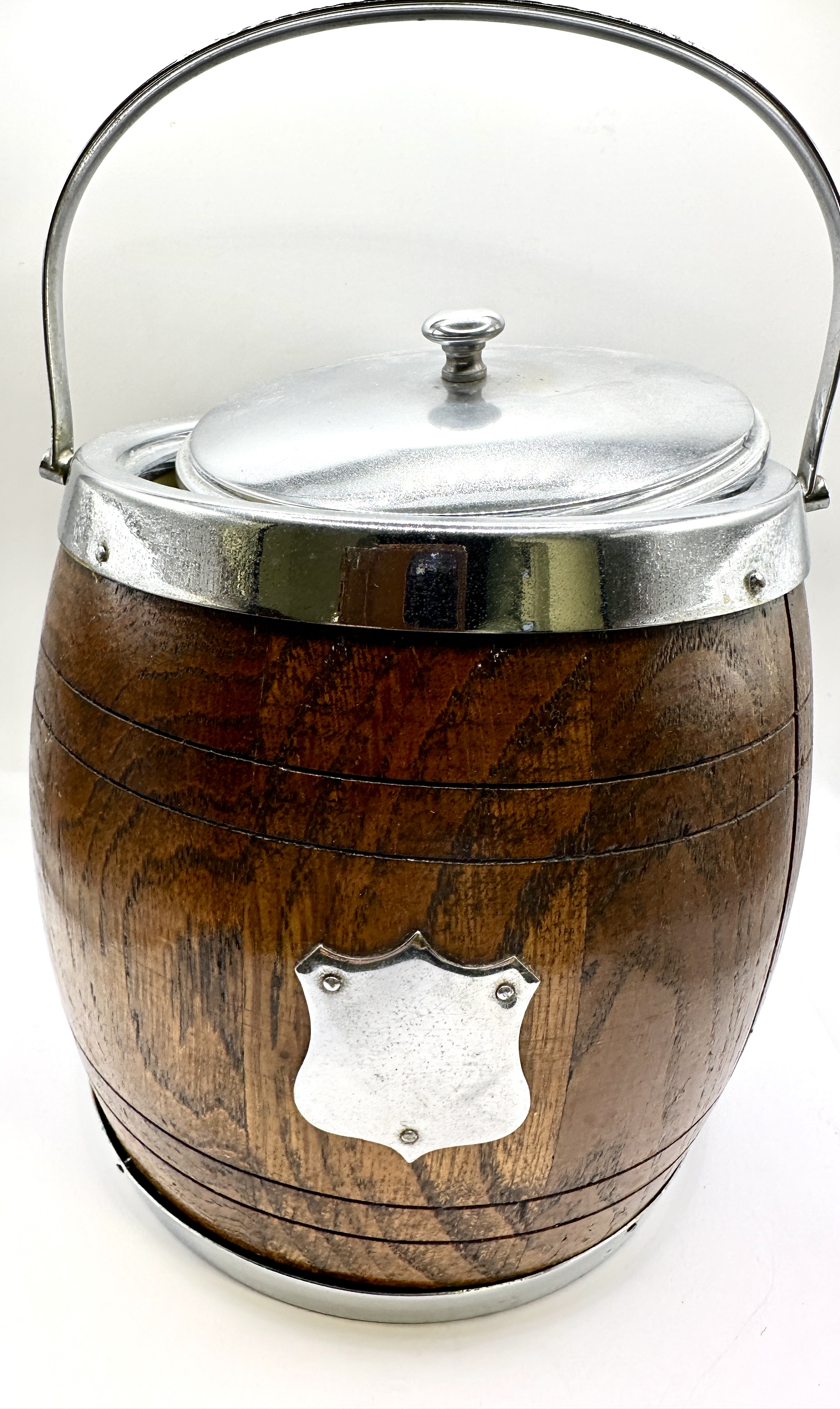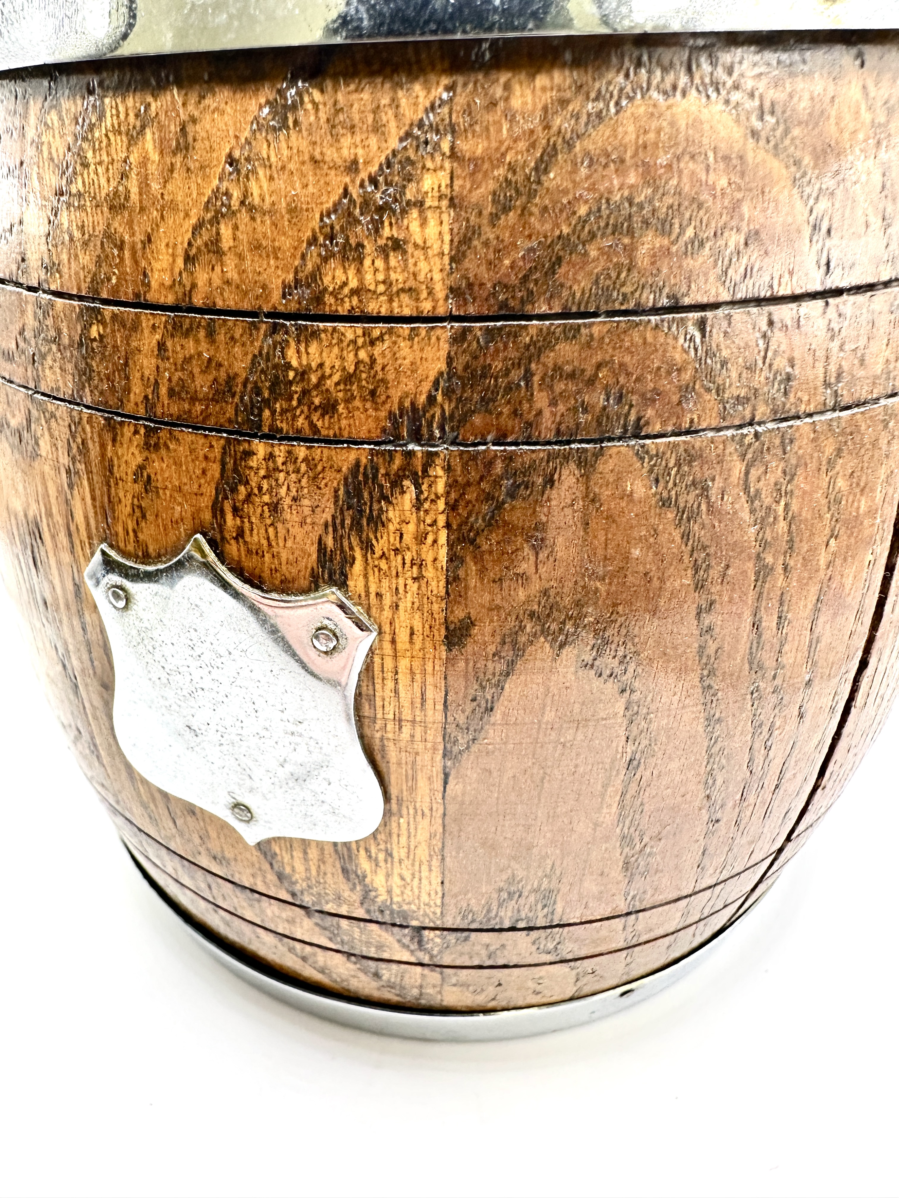 A traditional English coopered oak biscuit barrel featuring wooden staves bound by silver-toned metal hoops at the top and base. The barrel is fitted with a matching silver-toned lid featuring a central turned knob and a wire swing handle. A blank shield-shaped metal cartouche is mounted to the front elevation. The interior contains a removable off-white ceramic liner. Accompanying the barrel is an assortment of five small, turned, and hand-painted wooden miniature fruits, including representations of an apple, lemon, lime, pear, and a grooved bulbous form. The base of the ceramic liner displays remnants of a blue printed mark, including the numeral 7 and other illegible characters.