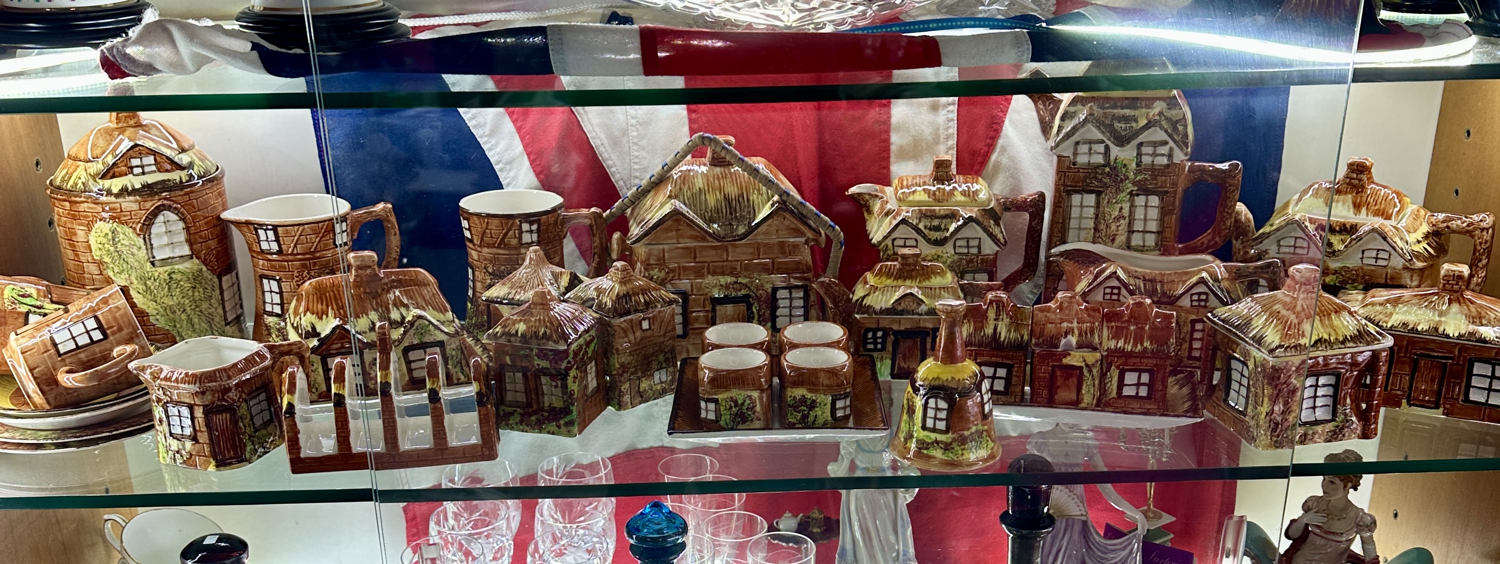 This collection consists of an assortment of glazed earthenware items from the Ye Olde Cottage range, manufactured by Price Kensington in England. The pieces feature relief-moulded details characteristic of the pattern, including thatched roofs, brickwork, multi-paned windows, and climbing floral foliage. Decoration is applied using hand-painted underglaze colours in shades of brown, yellow, green, and red. The grouping includes a wide variety of functional and decorative tableware and kitchenalia: a tall, cylindrical lidded biscuit jar; multiple teapots of varying sizes, including one with a raffia-wrapped handle; several milk jugs and creamers; lidded sugar bowls; a four-slot toast rack; a set of egg cups on a matching rectangular tray; a large pitcher; several mugs; a novelty ceramic bell; and a set of cups with matching saucers.