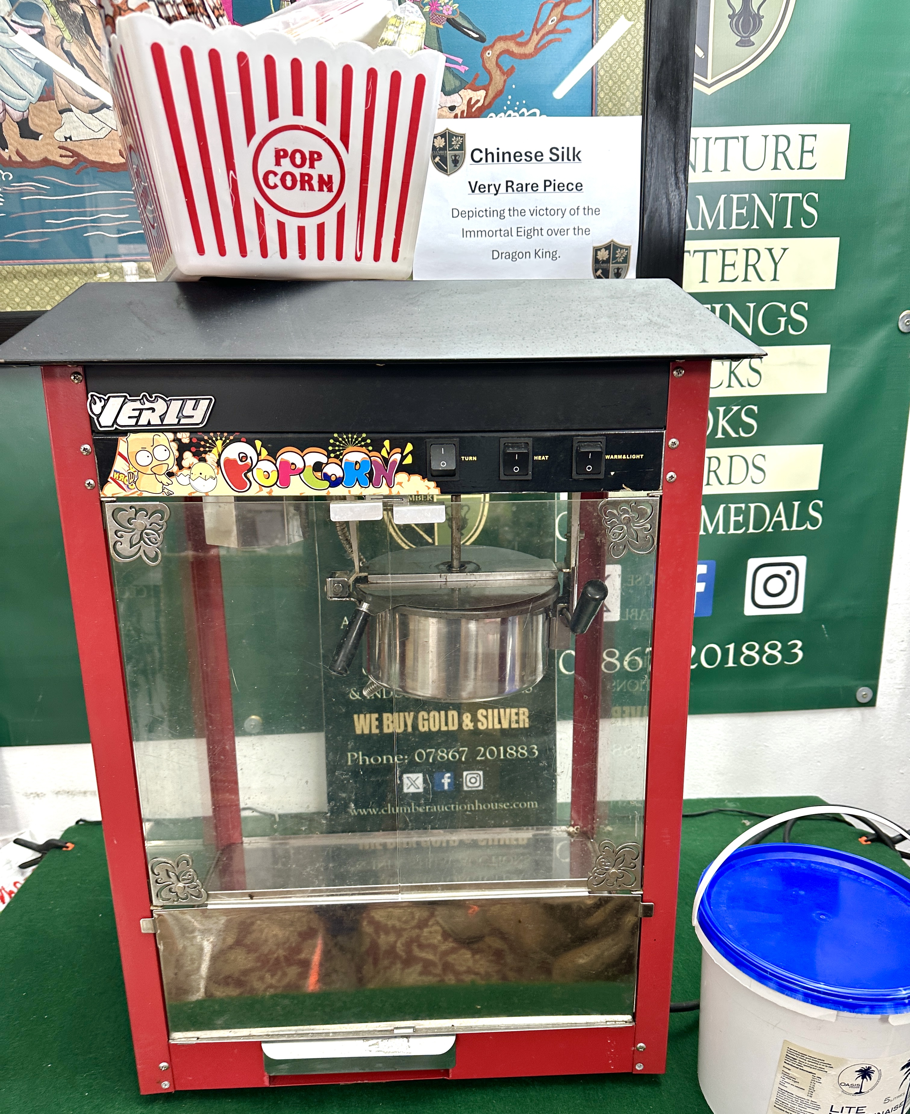The machine is in used condition with visible residue and smearing on the transparent panels. The internal kettle and warming deck show signs of previous use and carbon build-up. The exterior frame exhibits minor surface wear. The unit is sold as seen and has not been electrically tested.