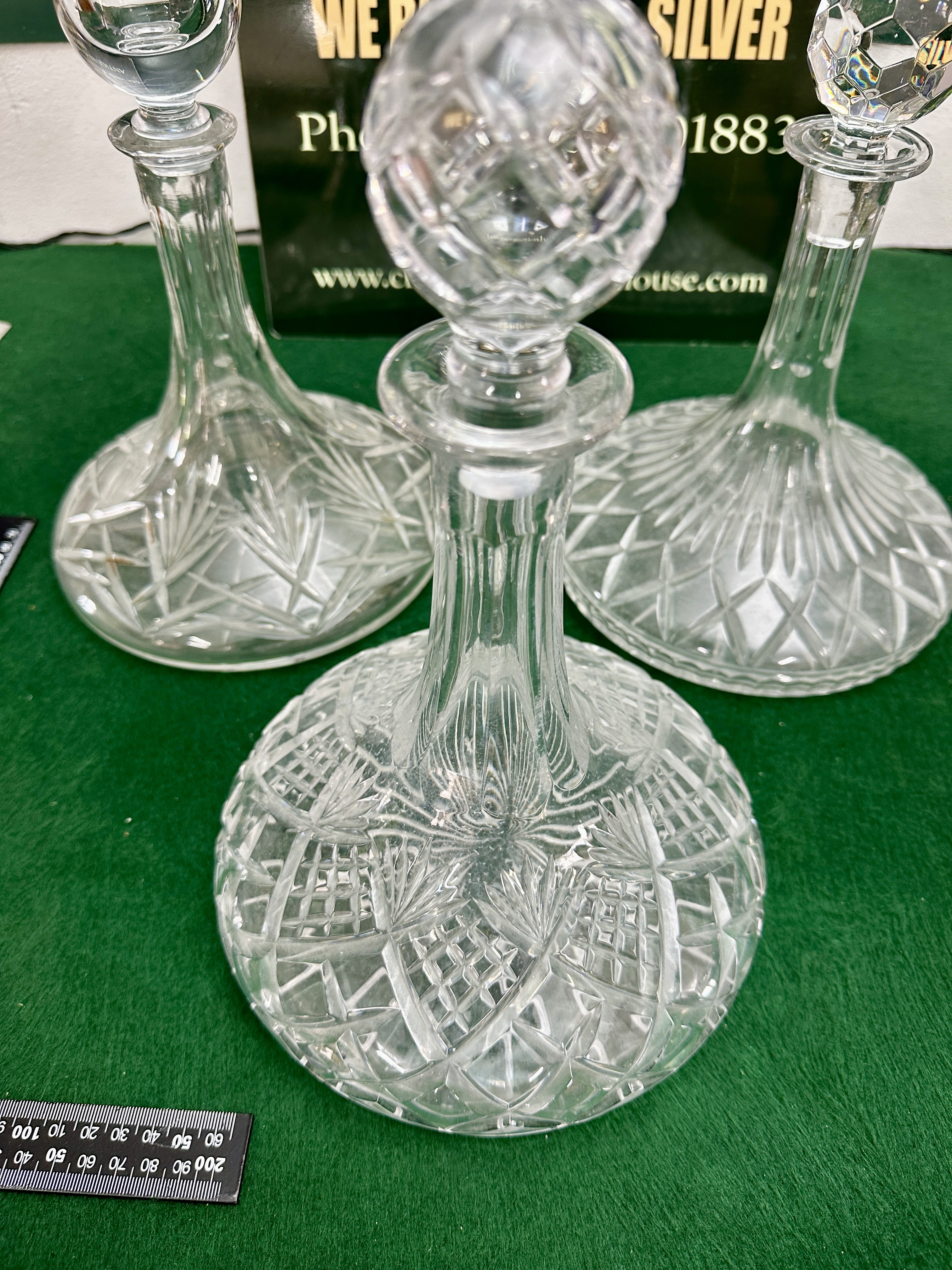 A trio of clear cut crystal ship’s decanters, also known as captain’s decanters, characterised by their broad, stable bases. The central decanter features a complex cutting pattern on the body consisting of diamond-cut fields and fan motifs, with a fluted neck and a large, faceted ball stopper. The decanter on the left displays a pattern of fanned lines over a criss-cross diamond-cut band at the base, with a fluted neck and a smooth ball stopper. The decanter on the right is decorated with a large-scale, repeating geometric diamond-cut pattern, featuring a fluted neck and a multi-faceted geometric stopper. All three pieces are crafted from high-quality lead crystal, exhibiting sharp, deep-cut patterns and high clarity. No maker’s marks or signatures are visible on the bases or bodies.