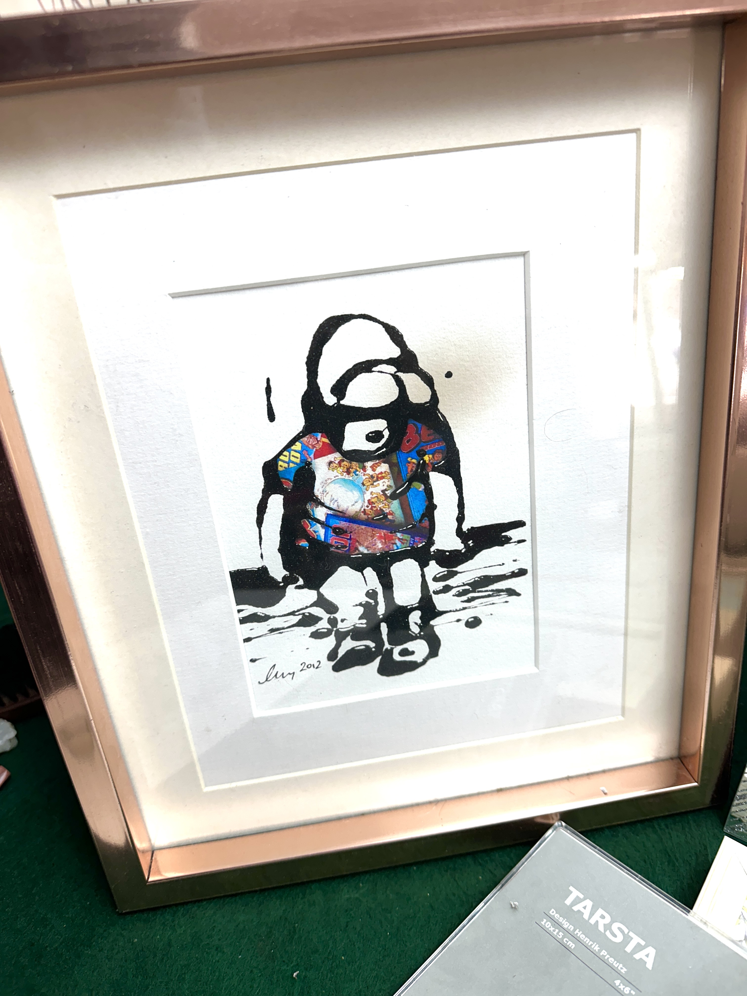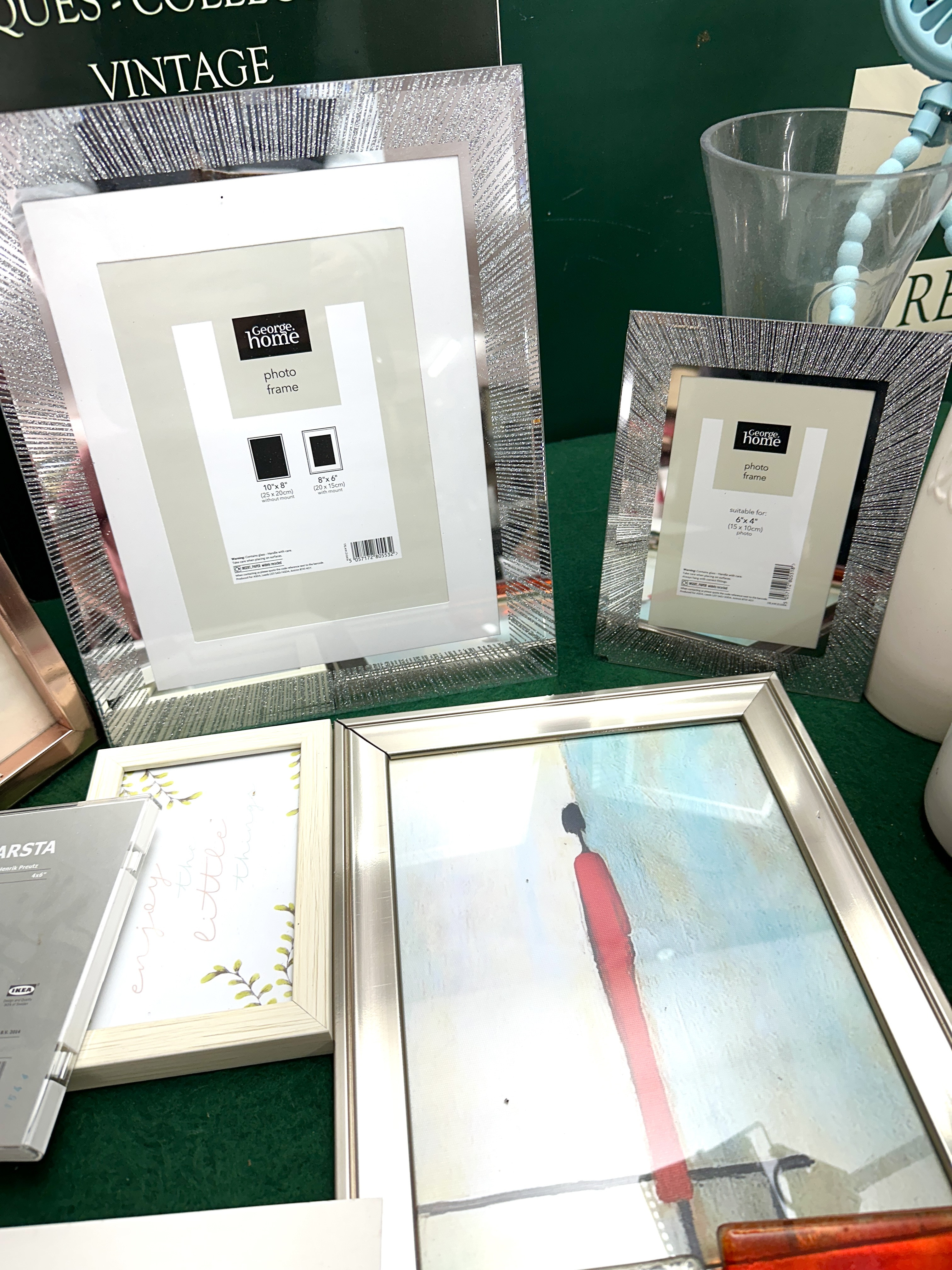 A collection of various decorative household items and artworks. The group includes several framed and matted pieces: a framed print of a figure in a patterned shirt, signed Luy 2012 and set in a copper-toned frame; an unframed matted watercolour depicting a street scene; and a framed minimalist print of a red figure in a silver-toned frame. The assortment also features multiple photo frames, including two silver-effect George Home frames, a boxed IKEA Tarsta frame designed by Henrik Preutz, and a small white frame inscribed with the phrase enjoy the little things. Further items consist of a boxed Minky Bobble Remover, a white ceramic jug embossed with the word Love, a clear glass vase, a jar candle, two fused glass coasters in blue and red, and a small blue portable fan.