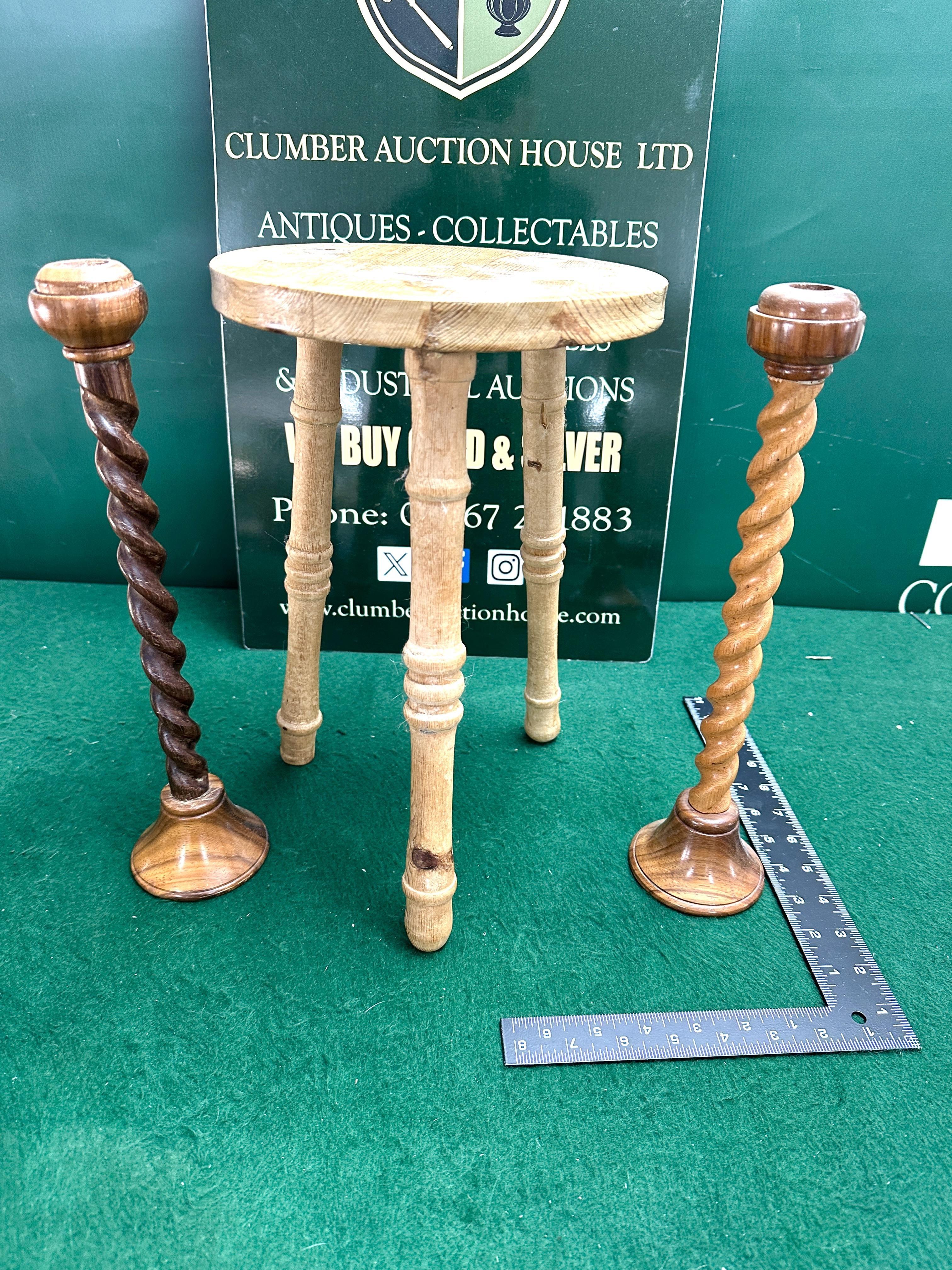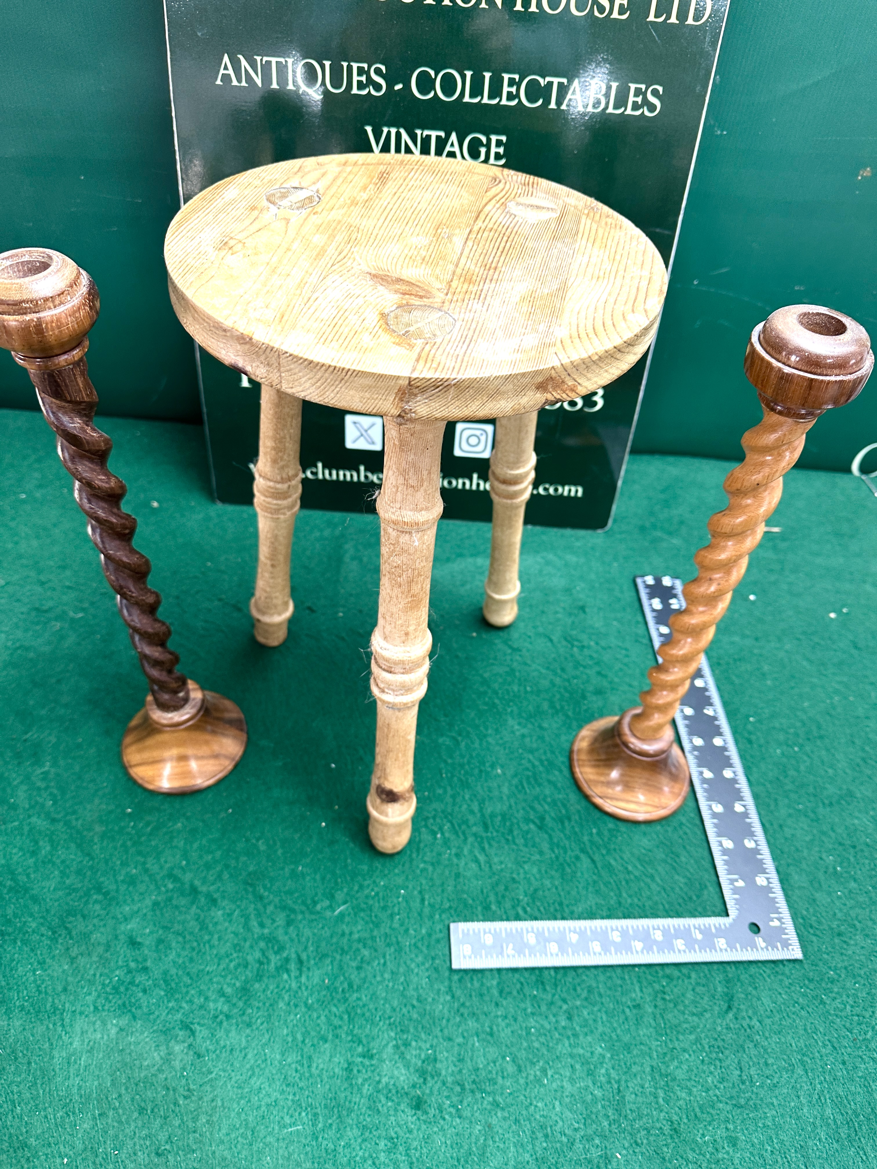A small three-legged stool of country vernacular style, constructed from a light-toned solid wood. The stool features a solid circular top with three visible wedged tenon joints where the legs are secured. It is supported by three simple turned legs. Included is a pair of wooden candlesticks featuring traditional barley-twist stems. One candlestick is finished in a dark stain, while the other displays a lighter natural wood finish. Both candlesticks are designed with turned circular bases and sconces.
