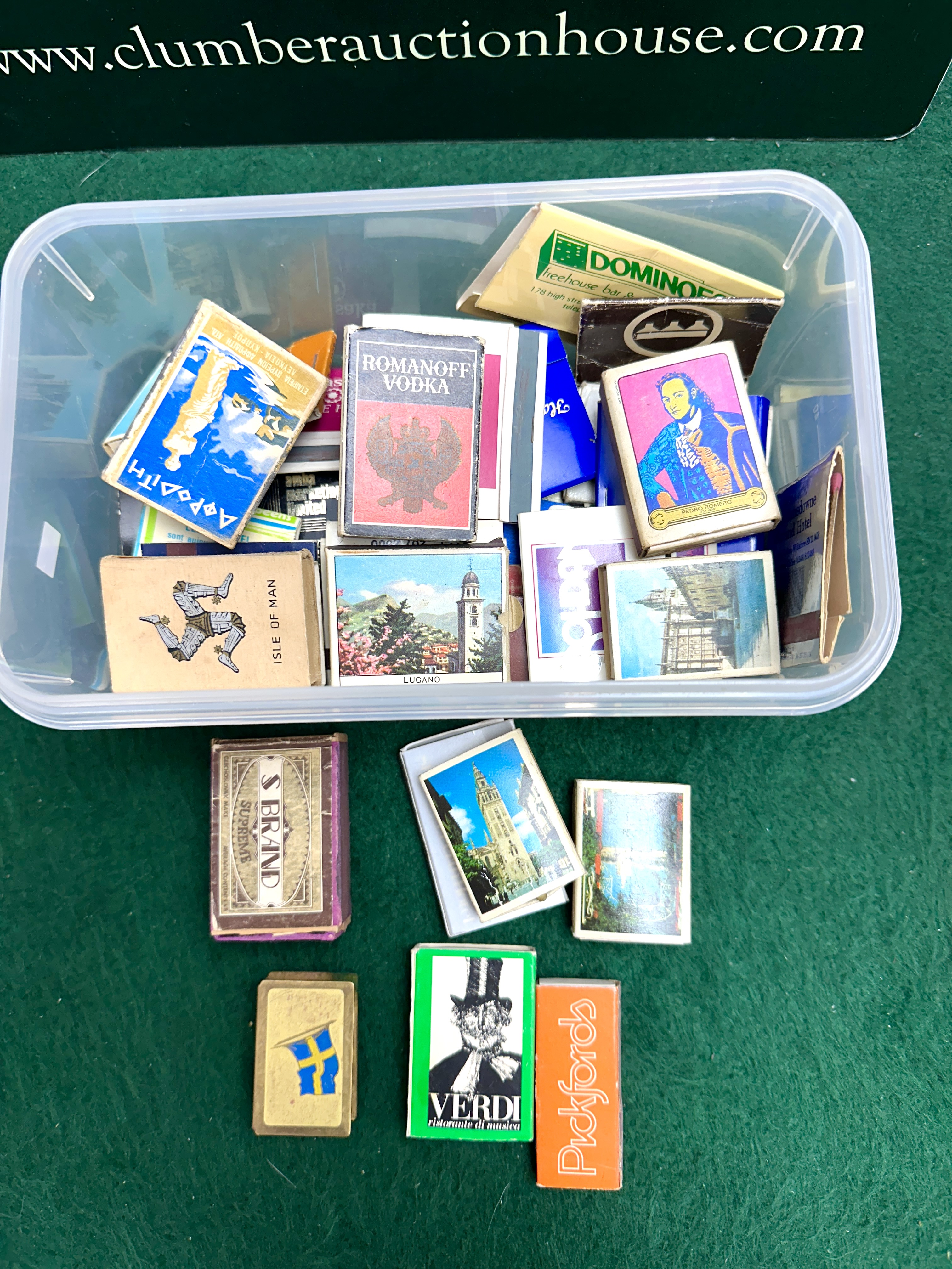 The items are in good vintage condition overall. There is visible wear to the strike strips and edges of several boxes, consistent with age and handling. Some boxes appear to contain original matches, while others are empty. The plastic storage container shows light surface scuffing.