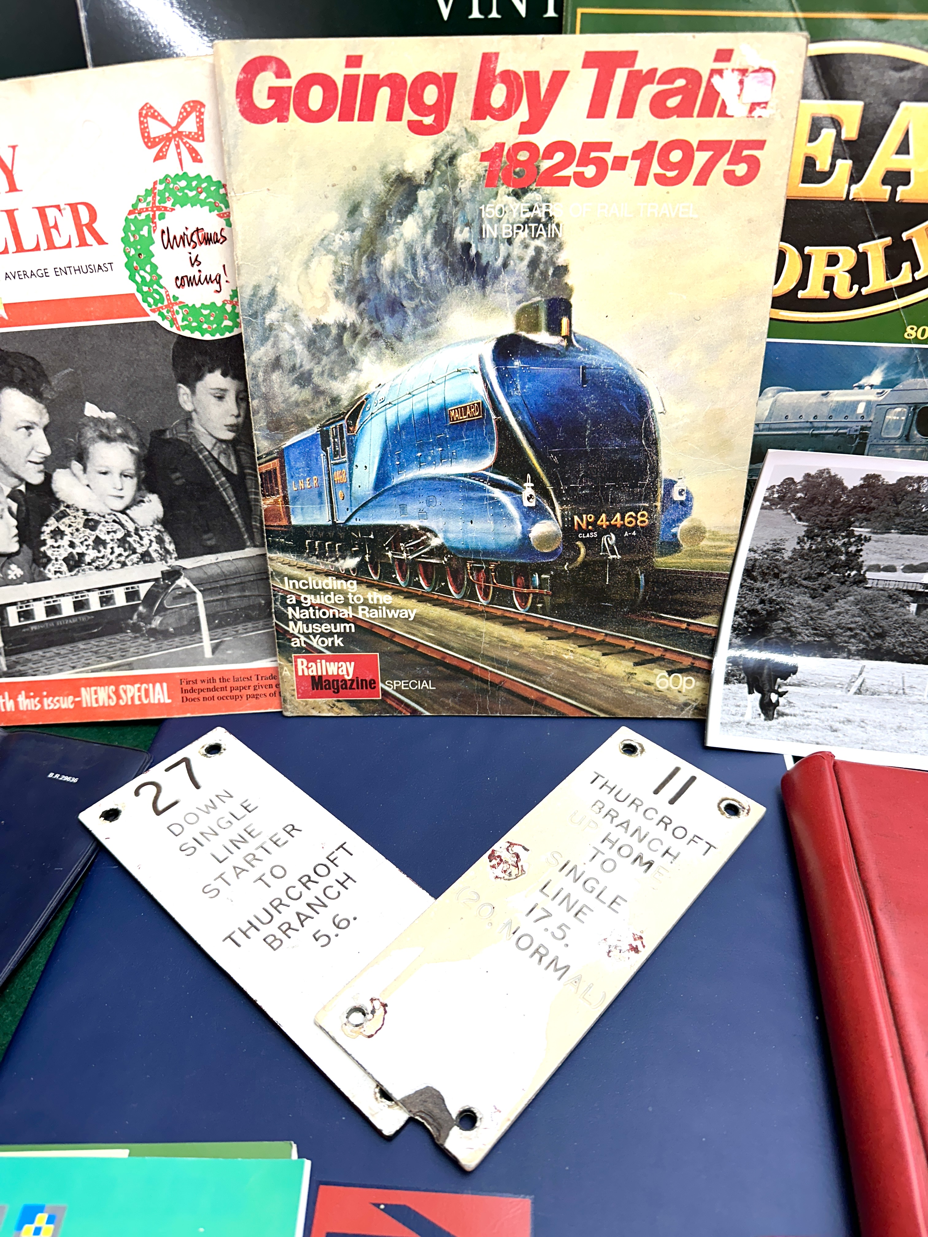 An assortment of British railway related items comprising magazines, official manuals, and signalling hardware. The collection includes a December 1965 issue of Railway Modeller, the first issue of Steam World magazine, and a Railway Magazine special titled Going by Train 1825-1975 featuring the LNER Class A4 locomotive Mallard. Official documentation includes a green cloth-bound volume of Regulations for Train Signalling and Signalmen’s General Instructions dated 1 October 1972, a red British Rail Rule Book, and a Periodical Operating Notice for the Eastern Region Northern Area dated June to August 1980. Also present is a 1969 National Union of General and Municipal Workers rule book and a 1993 Trainload Freight East Midlands booklet. The lot features two white enamelled metal signal box lever plates for the Thurcroft Branch: plate number 27 for the Down Single Line Starter and plate number 11 for the Branch Home to Single Line. Additional items include a blue British Railways binder for D.C. Electrified Lines, a red 1991 Safety Items folder, and a black and white photograph of a train crossing a viaduct.