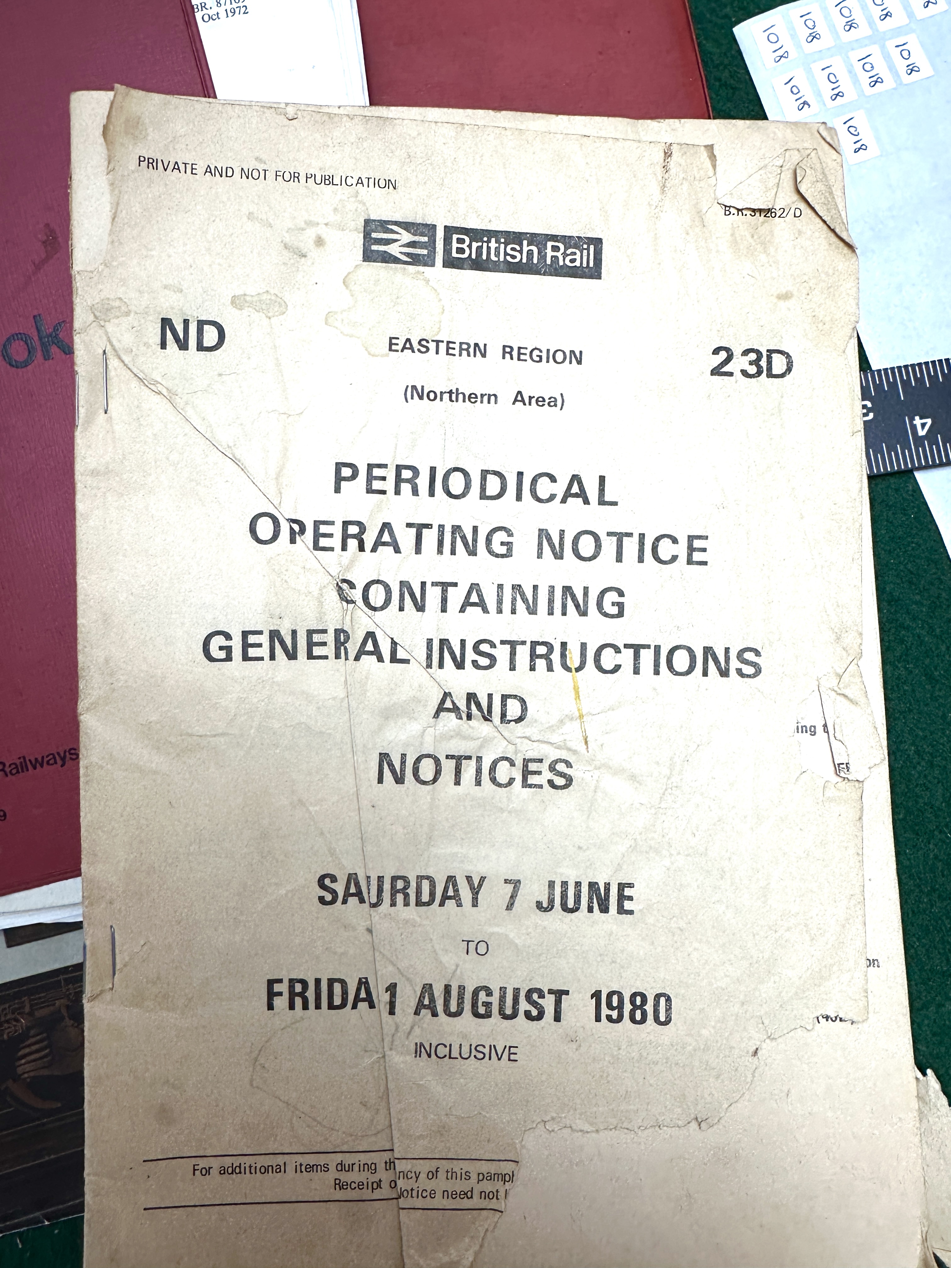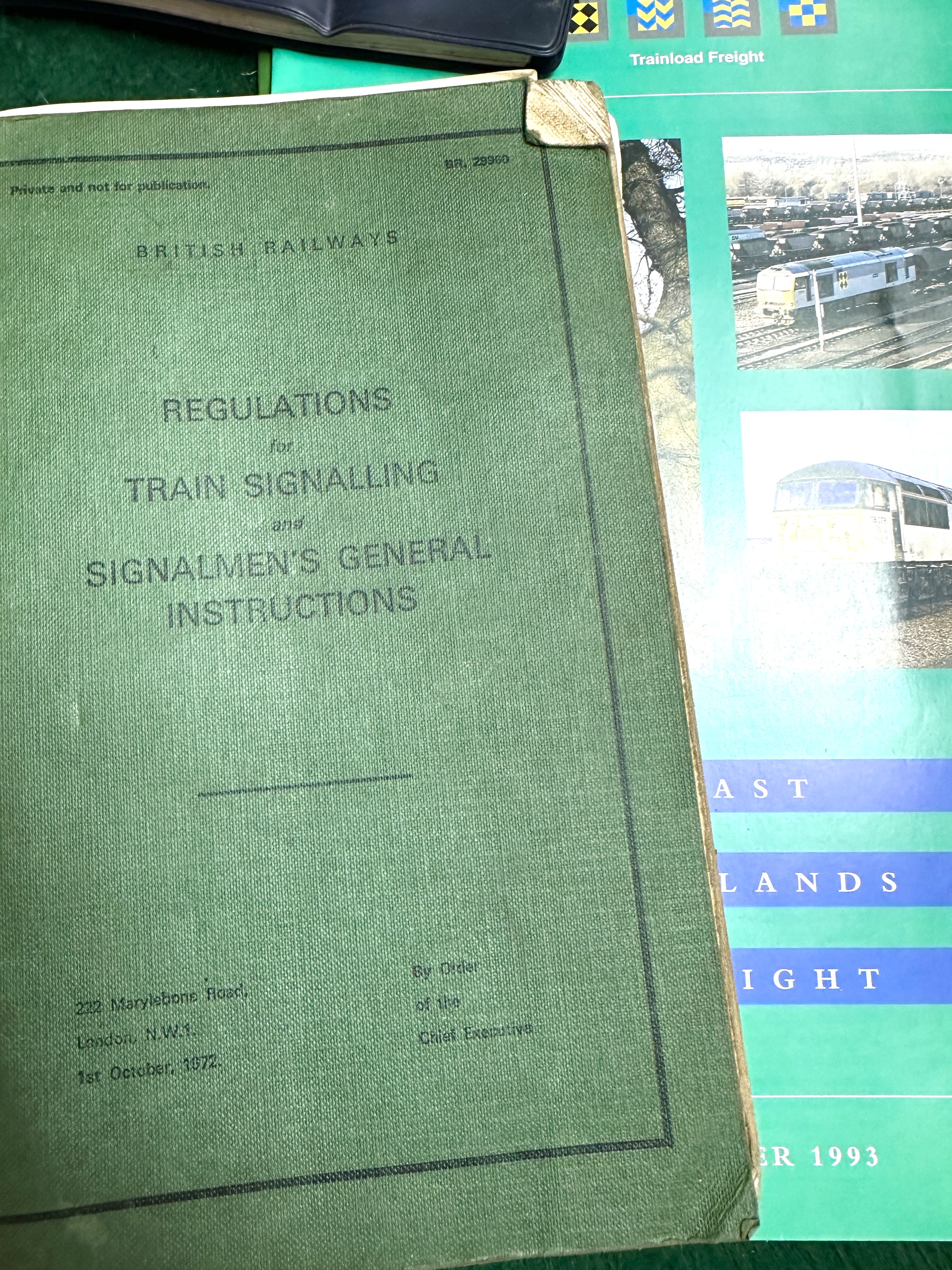 Items show varying degrees of age-related wear. The 1972 signalling manual has bumped corners and surface scuffing to the cloth binding. The 1980 operating notice is in poor condition with significant tears, heavy creasing, and staining to the paper covers. Enamelled lever plates exhibit some chipping around the mounting holes and edges. Magazines and booklets show standard shelf wear, minor creasing, and typical toning to paper surfaces.
