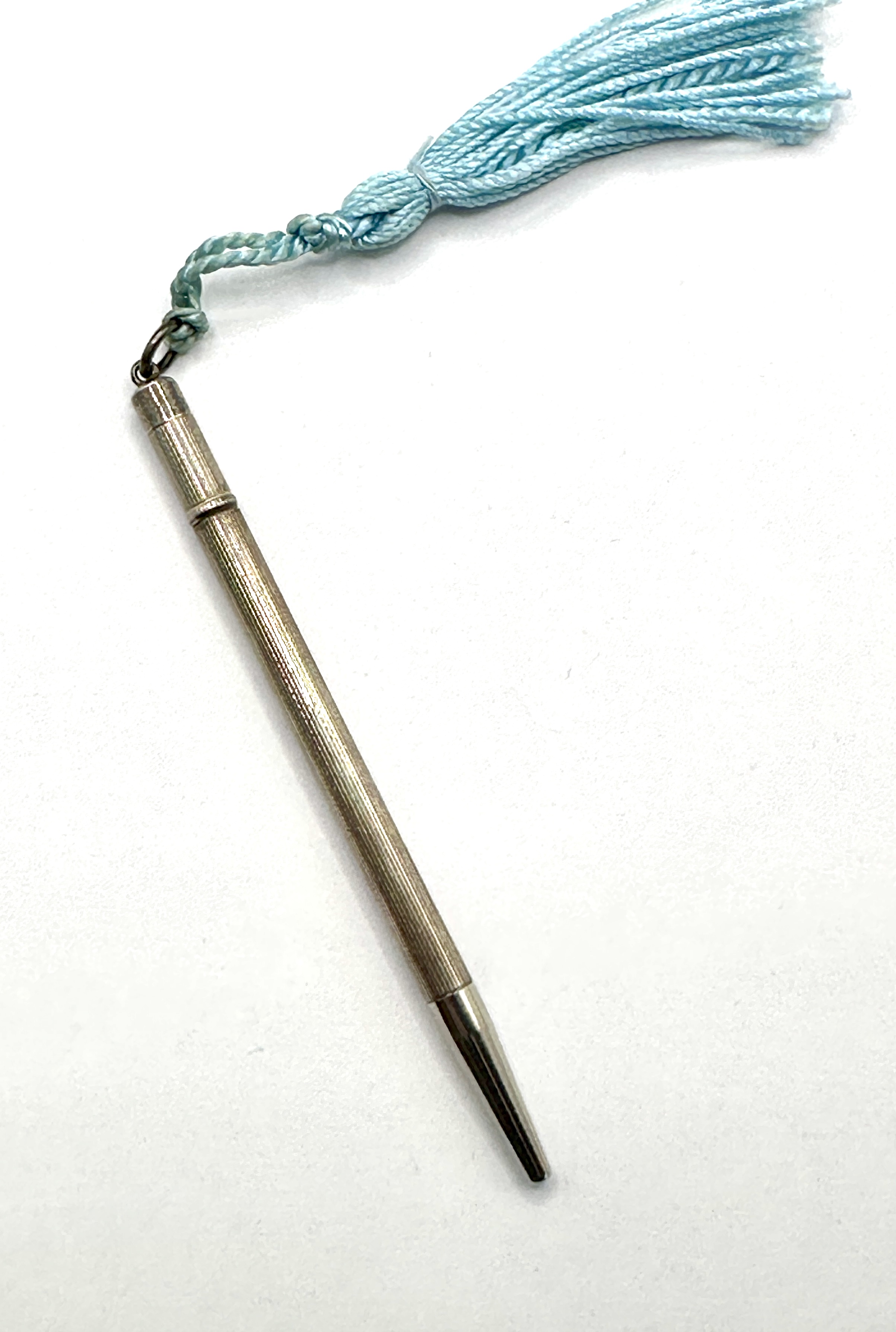 A vintage 925 silver miniature propelling pencil of a type traditionally used for chatelaines or dance cards. The cylindrical barrel is decorated with a linear engine-turned guilloché pattern. A suspension ring is attached to the top, which holds a pale blue corded textile tassel. The pencil has a smooth, tapered point and operates via a twist-action propelling mechanism. Small markings are visible on the barrel near the suspension ring. The item is presented in its original fitted box, which has a cream-coloured textured snakeskin-effect exterior and a contoured interior tray.