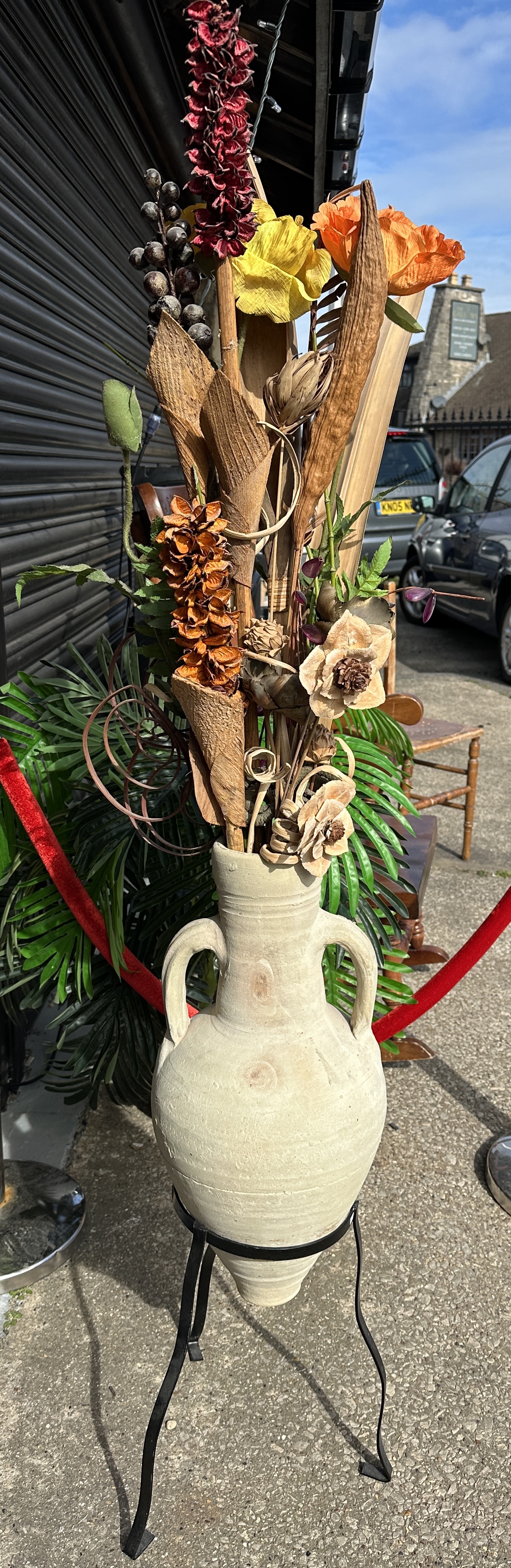 The ceramic vessel and metal stand appear to be in good condition. The surface of the earthenware shows staining and colour variations consistent with its intended rustic design. There are no significant chips, cracks, or visible repairs to the main body of the vase. The dried floral arrangement appears stable and intact.