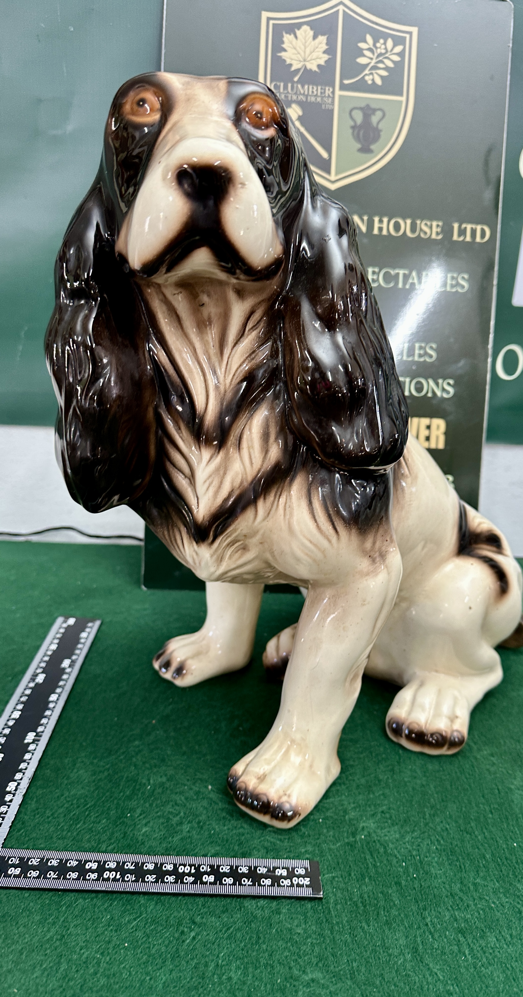 A large mid-century Italian glazed ceramic figurine of a seated spaniel, possibly modelled as a Cavalier King Charles or Springer Spaniel. The dog is depicted in a seated position with long, pendulous ears and a textured coat. It features a cream-coloured body with dark brown and black markings on the ears, face, and back. The figure is notable for its large, prominent inset amber-coloured eyes and a high-gloss finish.