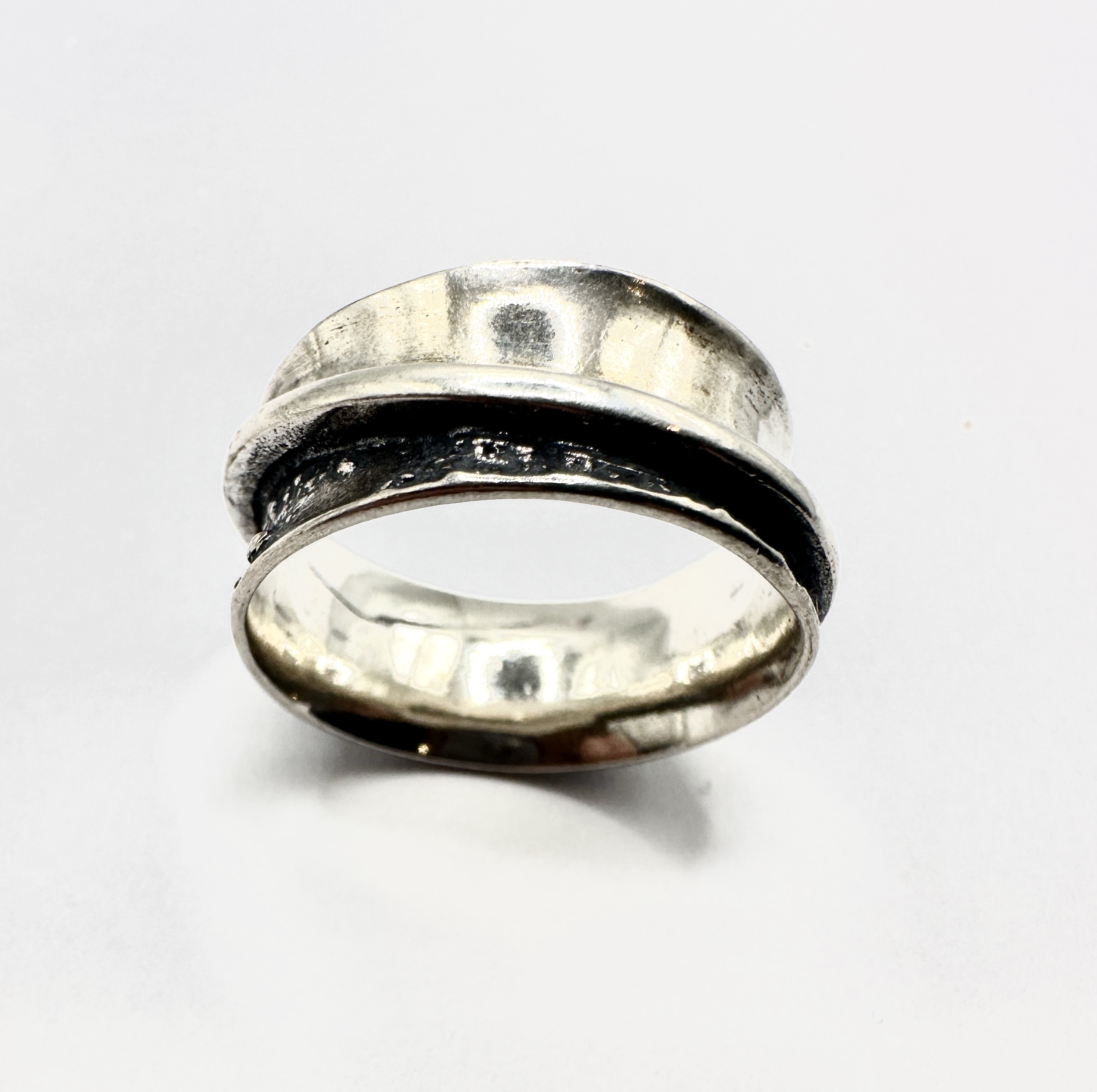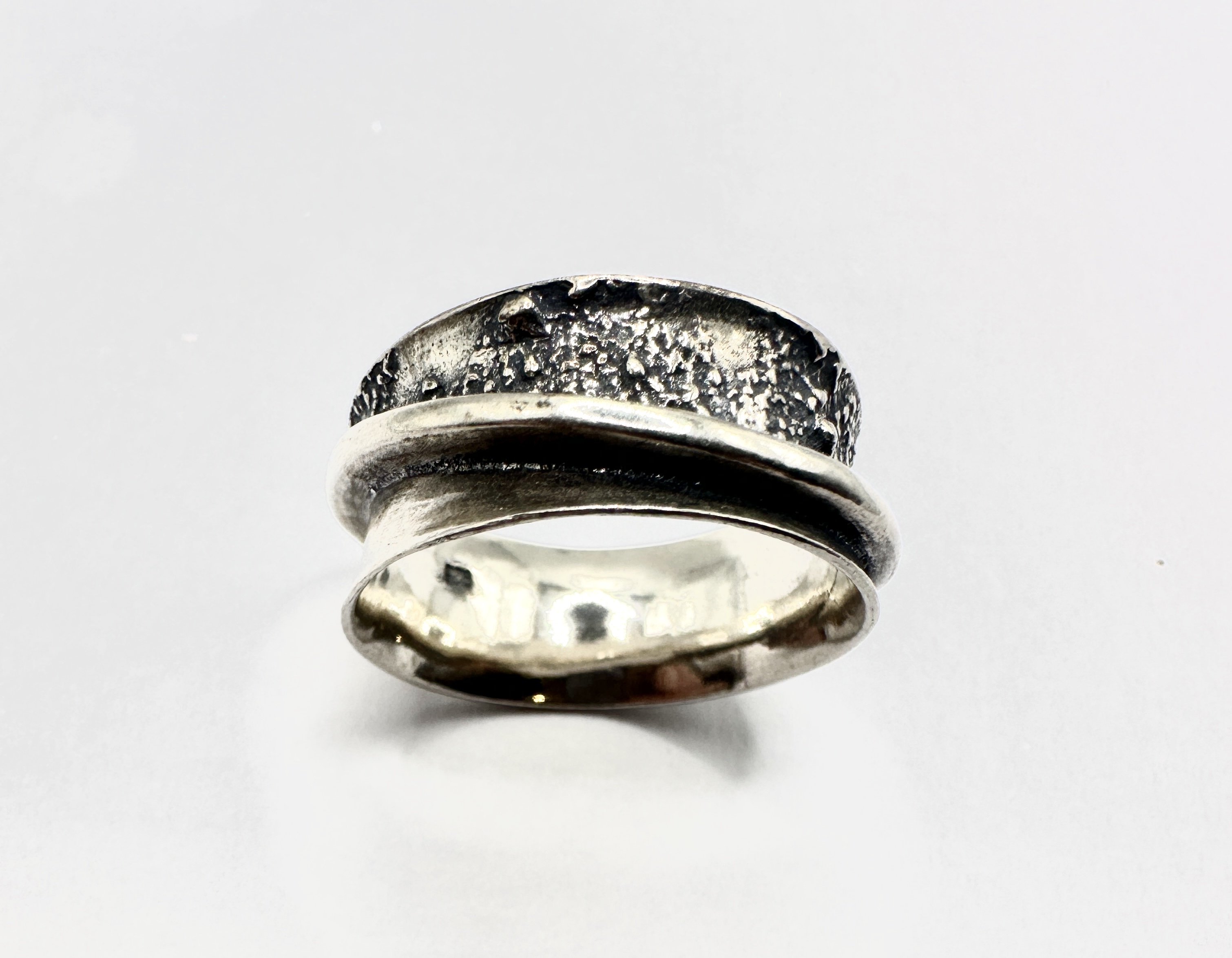 The ring is in good overall condition with intentional surface textures and patination. It displays minor surface wear and fine scratches consistent with a hand-crafted item.