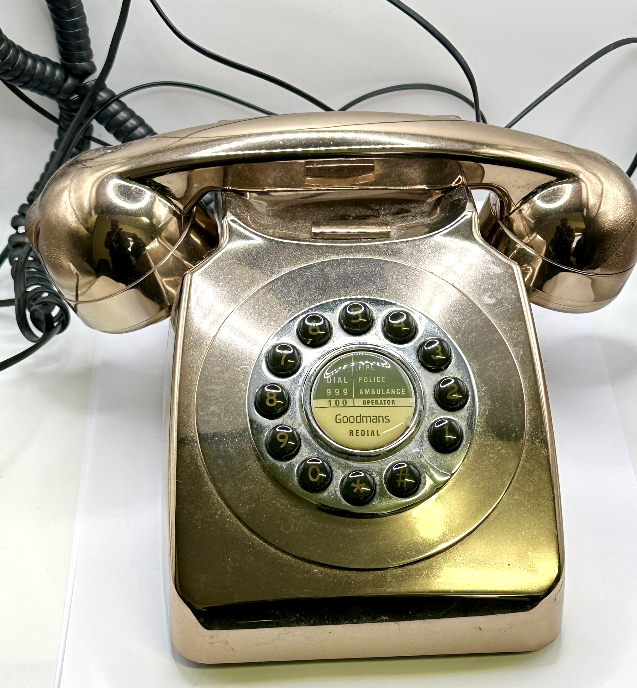 This is a corded telephone manufactured by Goodmans, designed in a retro style inspired by the classic British GPO 746 series. The body and handset are constructed from plastic with a highly reflective, polished metallic finish in a rose gold or copper tone. The telephone features a circular push-button keypad arranged in a rotary dial pattern, containing twelve buttons for numbers 0 to 9, star, and hash. A central circular insert on the dial face displays the Goodmans brand name and includes a redial button. The insert also features printed emergency service information common to the United Kingdom, including 999 for fire, police, and ambulance, and 100 for the operator. The unit is fitted with a black coiled handset cord and additional black rear connection cables.