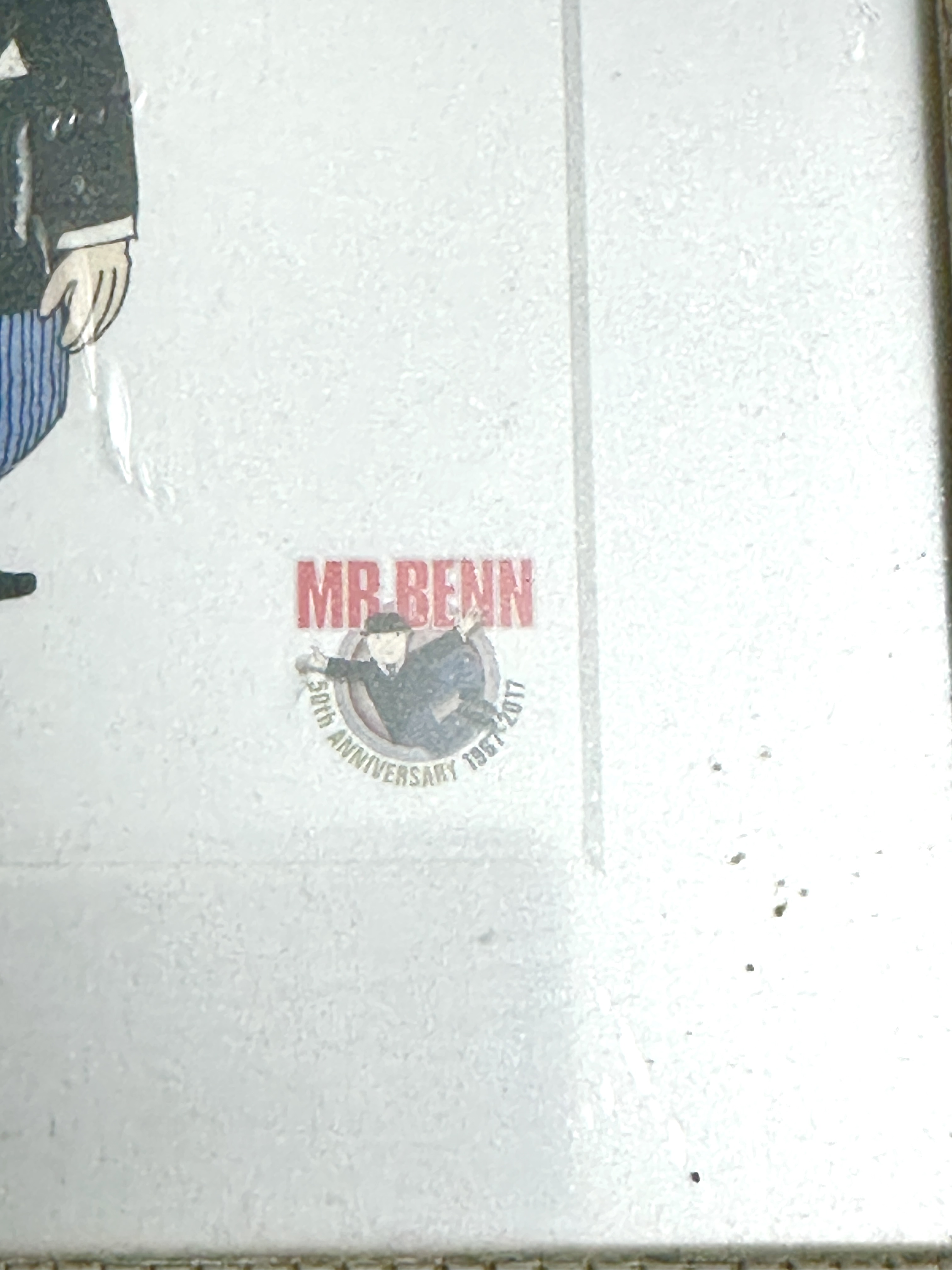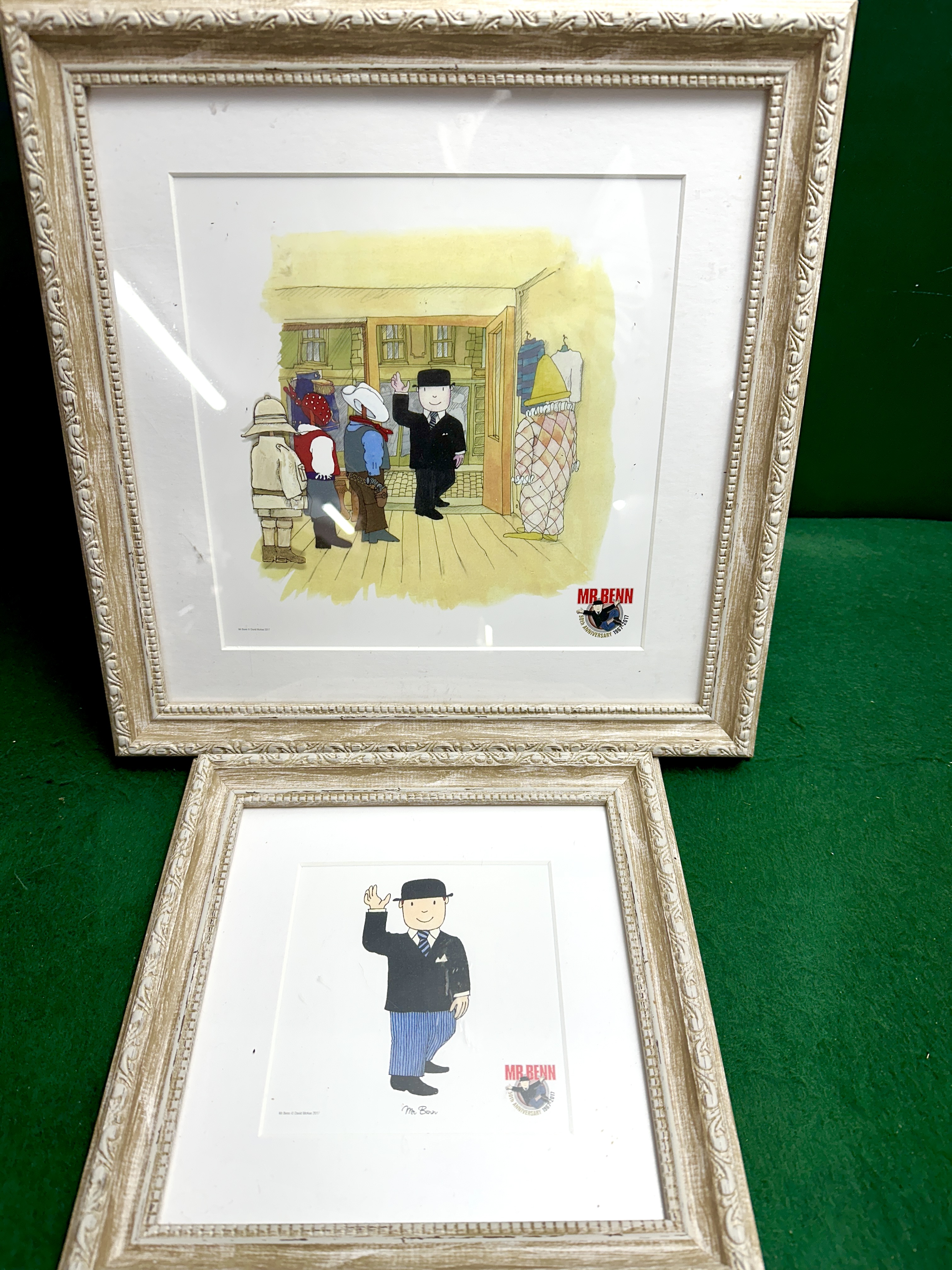 A pair of framed digital giclee prints produced to celebrate the 50th anniversary of the character Mr Benn, created by David McKee. The larger print illustrates a scene of Mr Benn entering the costume shop, accompanied by characters in explorer, cowboy, and harlequin costumes. The smaller print features a standalone depiction of Mr Benn in his signature black suit and bowler hat. Both prints include a red MR BENN logo and a circular 50th Anniversary 1967-2017 emblem in the lower right corner. The works are mounted and housed in matching cream-coloured wooden frames with decorative carved details. These prints do not bear hand-signatures or edition numbers.