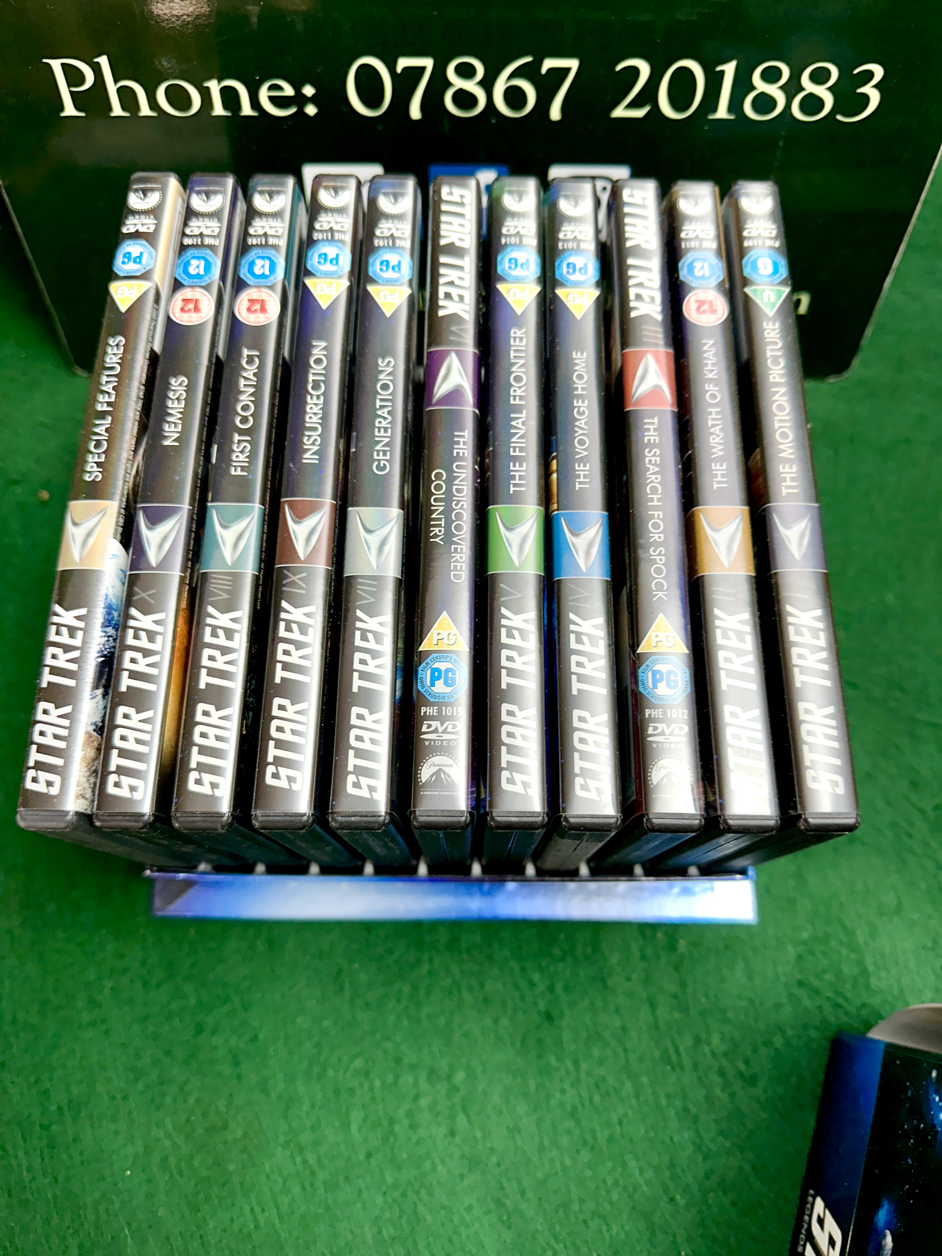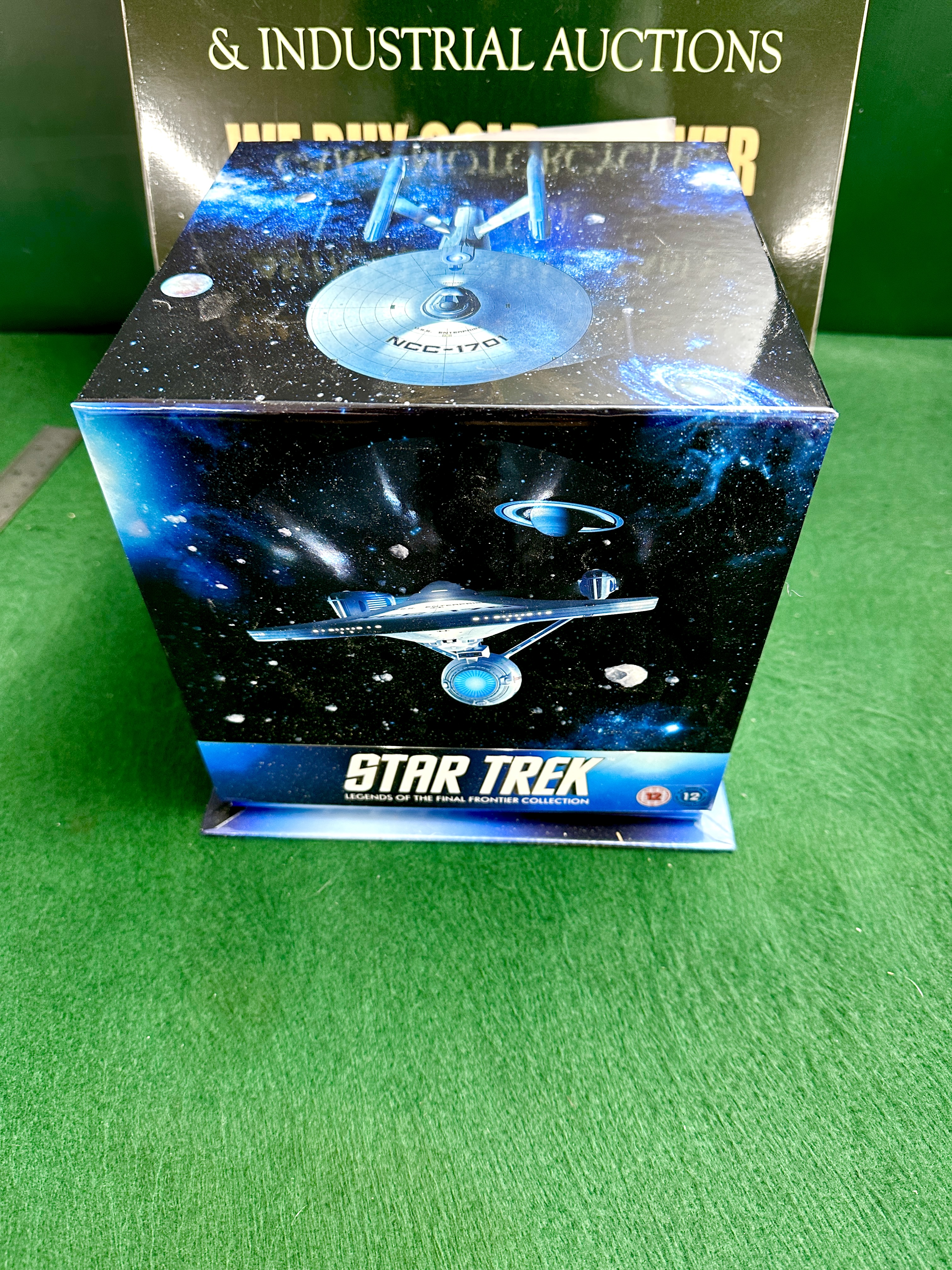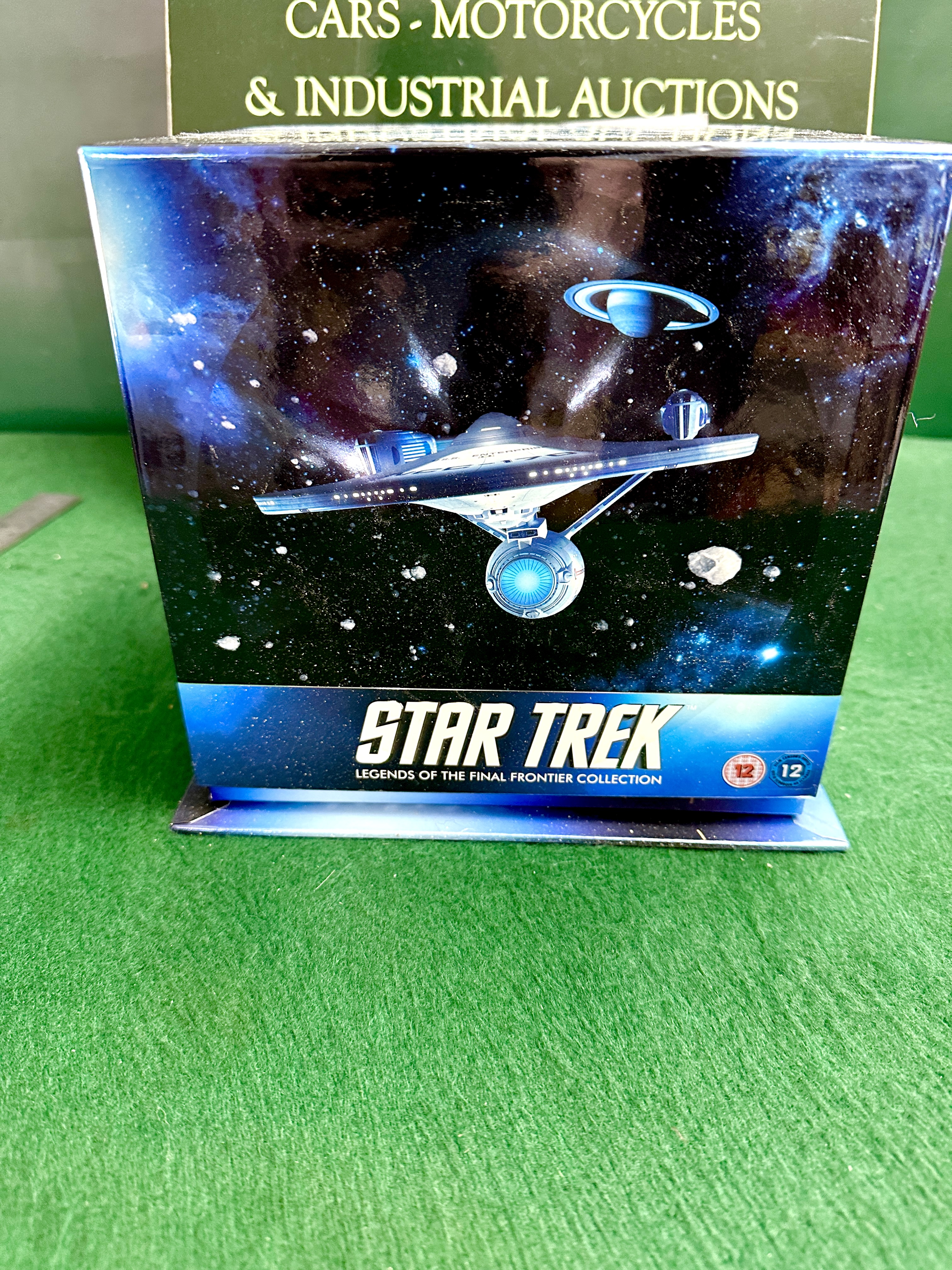 A Star Trek: Legends of the Final Frontier Collection DVD box set produced by Paramount Home Entertainment. The collection is housed in a cube-shaped outer slipcase featuring high-gloss space-themed graphics and illustrations of the USS Enterprise NCC-1701. The set contains an assortment of individual DVD cases including feature films from the franchise such as The Motion Picture, The Wrath of Khan, The Search for Spock, The Voyage Home, The Final Frontier, The Undiscovered Country, Generations, First Contact, Insurrection, and Nemesis, alongside a dedicated Special Features disc. Each spine displays the Paramount logo, the DVD Video logo, the film title with its corresponding Roman numeral, and a British Board of Film Classification rating of either PG or 12. Recorded product codes on the spines include PHE 1199, PHE 1011, PHE 1012, PHE 1013, PHE 1014, PHE 1015, PHE 1193, PHE 1192, PHE 1191, PHE 1190, and PHE 1182. This set is a UK Region 2 release.