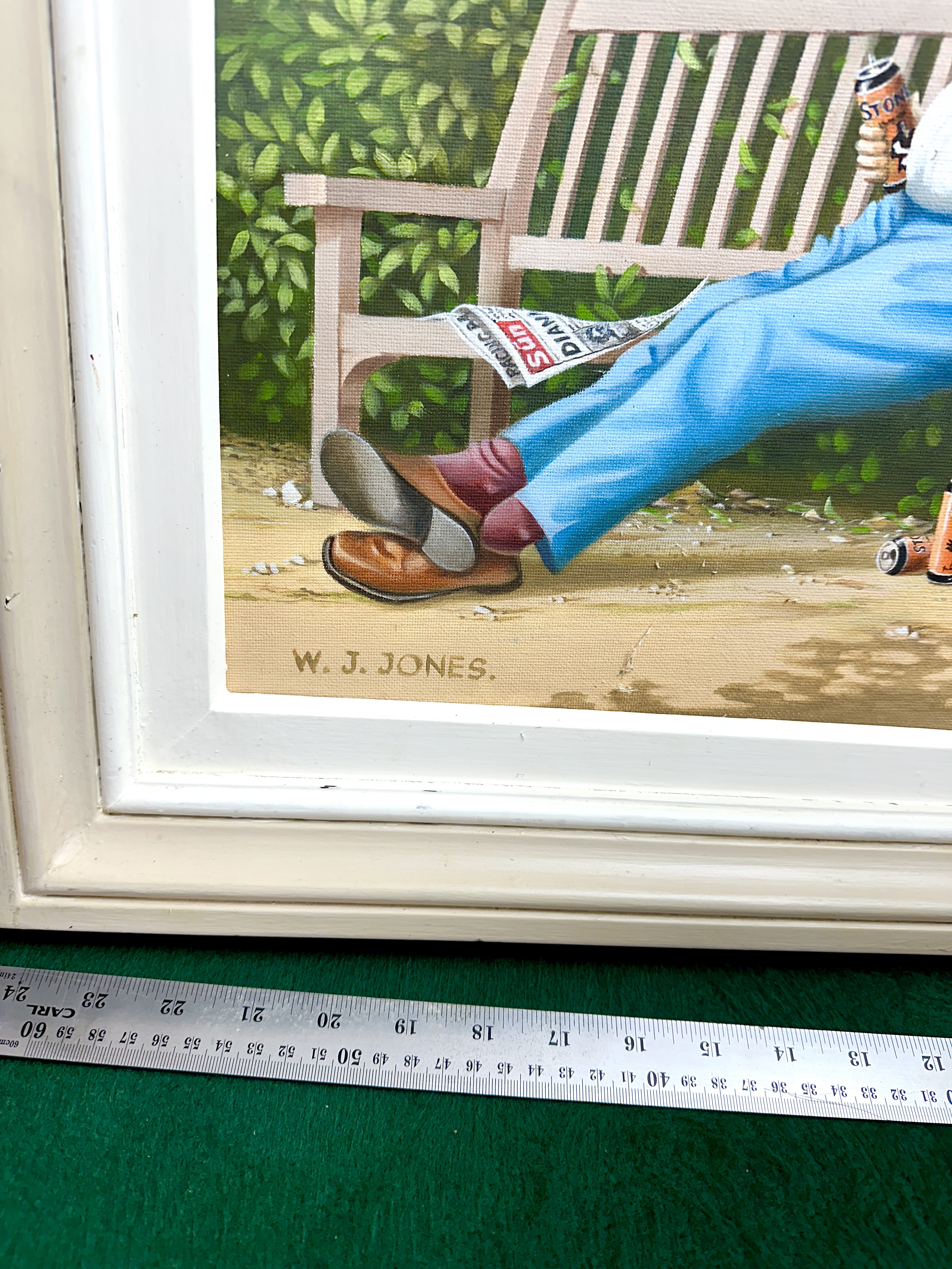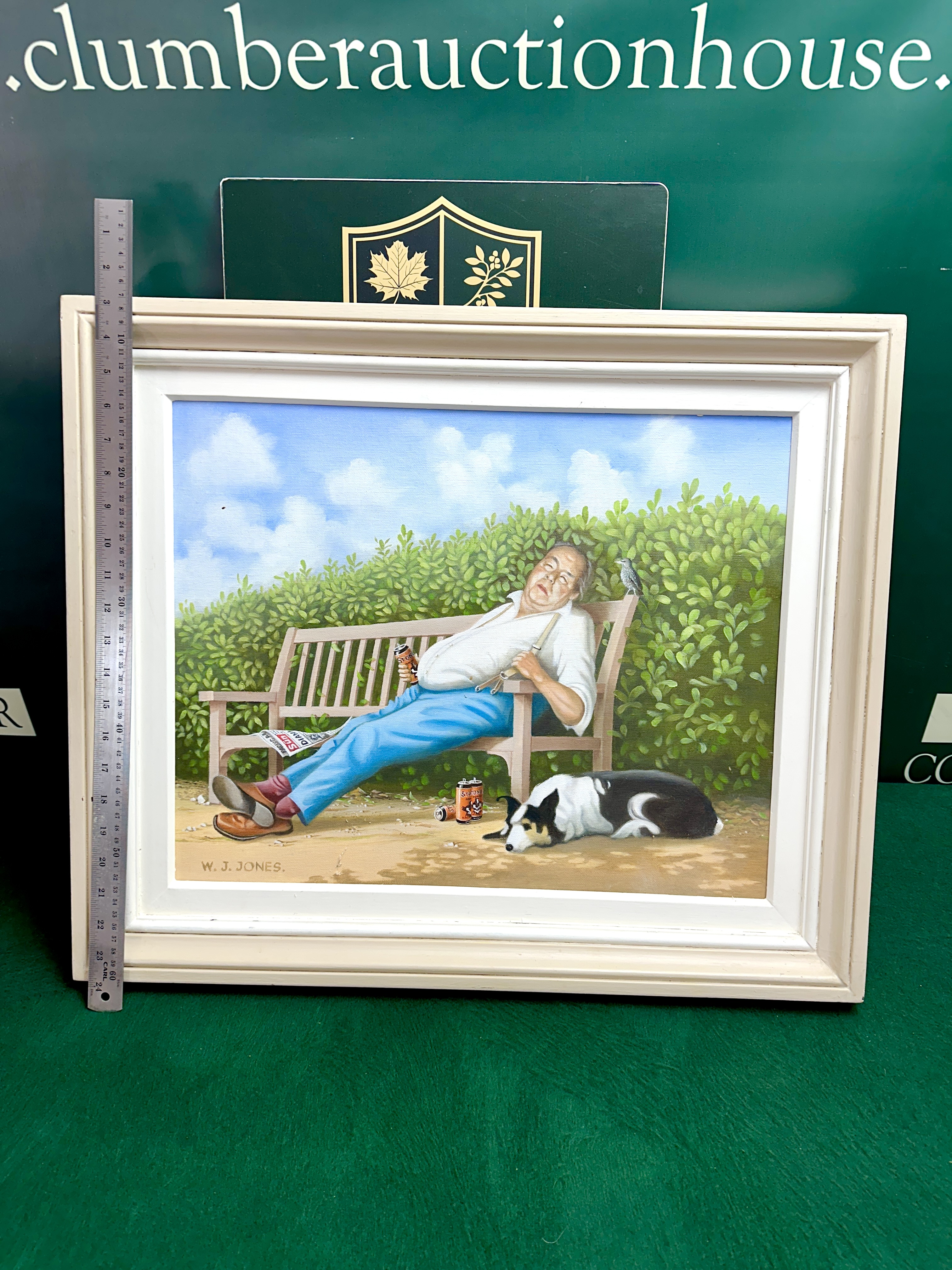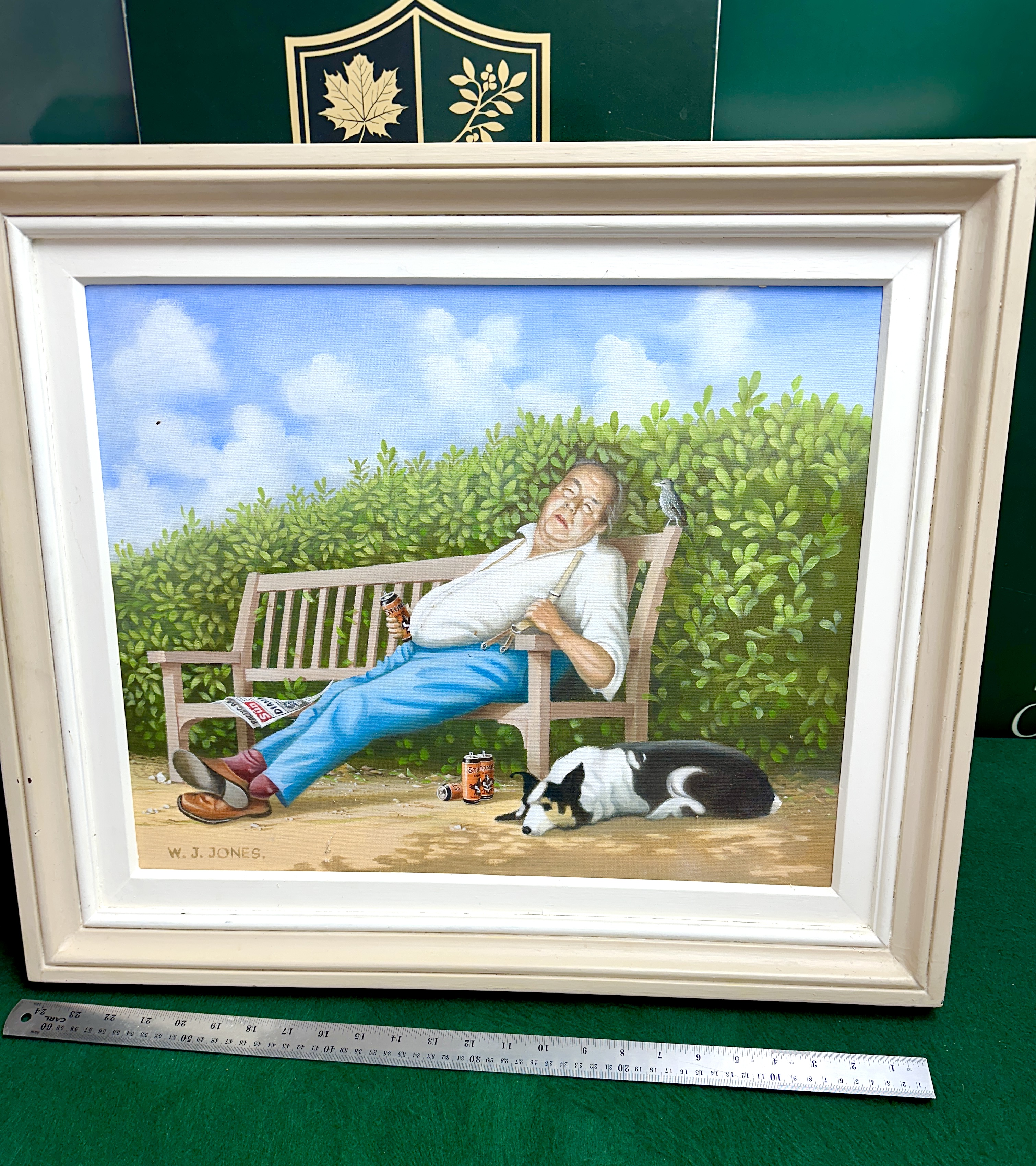 This oil on canvas painting by W. J. Jones depicts a humorous, naive-style scene of an older, portly man sleeping on a wooden garden bench. The subject is wearing a white shirt with braces, blue trousers, and brown shoes. He is shown clutching a beer can, with two further cans and a copy of The Sun newspaper on the ground. A black and white collie-type dog is asleep on the path, and a small bird perches on the backrest of the bench. The scene is set against a thick green hedge under a blue sky with white clouds. The work is signed W. J. JONES. in the lower-left corner and is presented in a white-painted multi-tiered wooden frame.