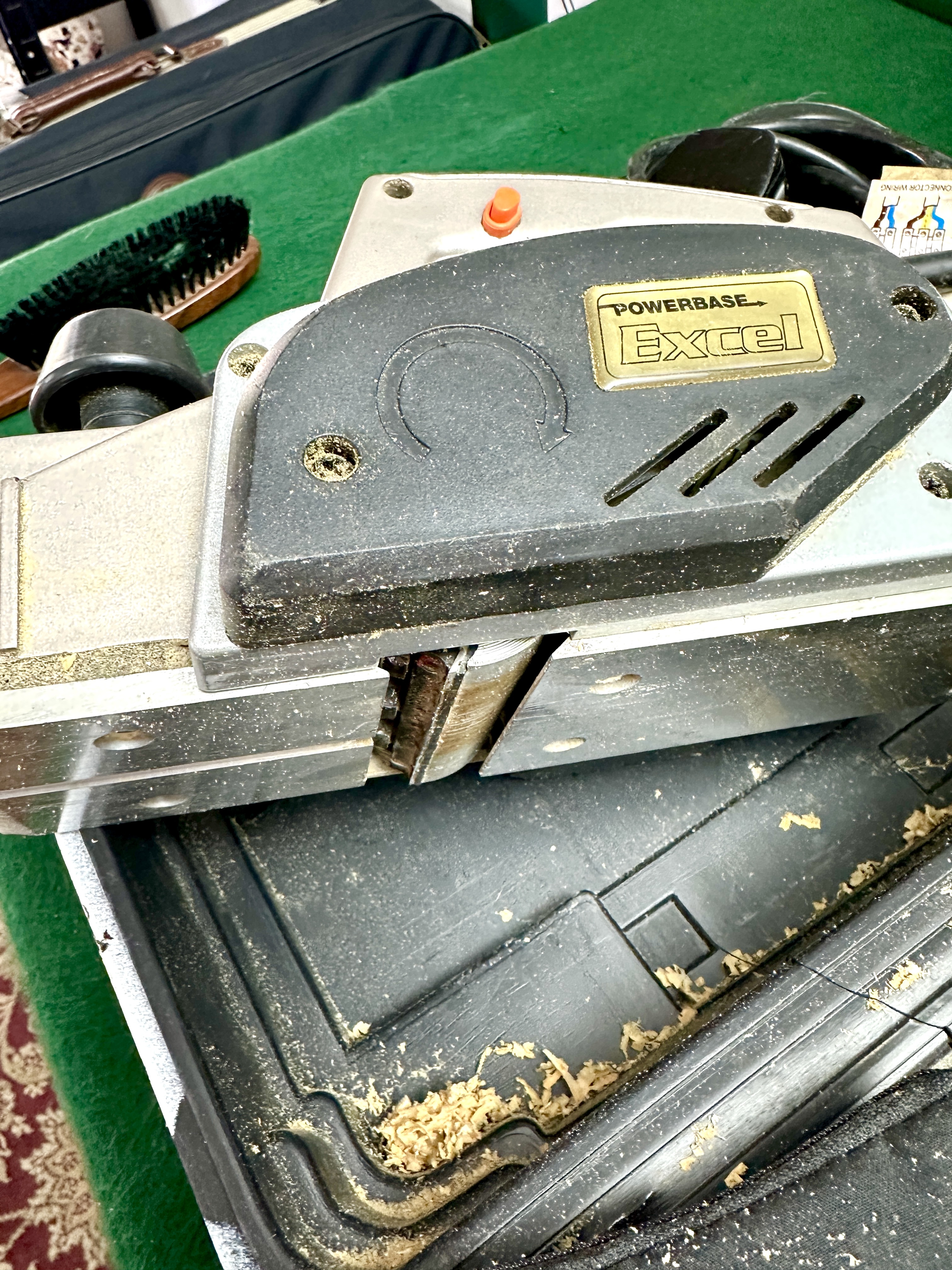The item is in used condition with significant residues of wood shavings and sawdust within the tool housing and the carrying case. There is visible surface oxidation and rust to the cutting blades and minor wear to the metal base plates. The tool is untested for working order.
