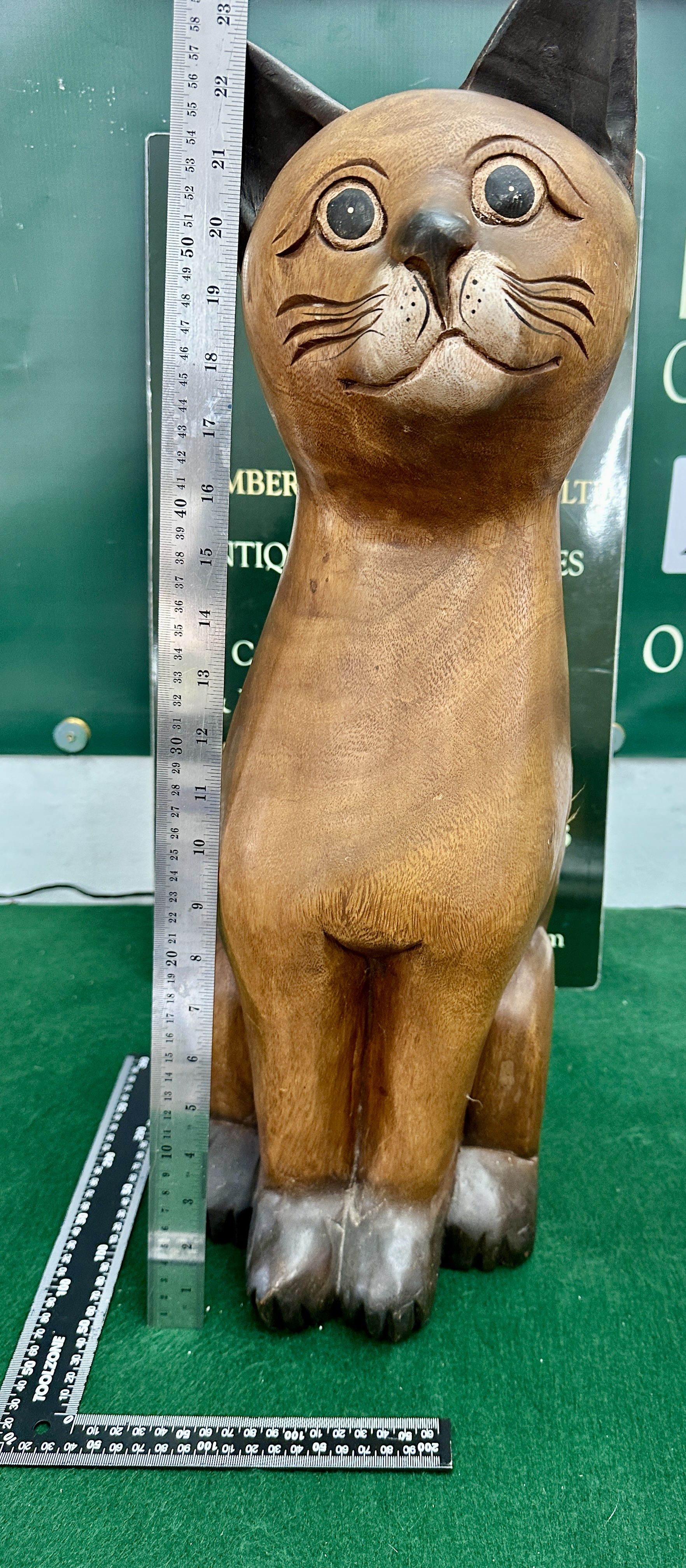 A large-scale decorative sculpture of a seated cat, hand-carved from solid wood. The figure is rendered in an upright, seated posture with detailed facial features including large carved eyes, a defined snout with whisker markings, and a slightly upturned mouth. The sculpture displays a prominent natural grain throughout the body, with darker stained accents applied to the ears, nose, paws, and tail to provide contrast. This style of large animal carving is characteristic of late 20th-century decorative imports from Southeast Asia.